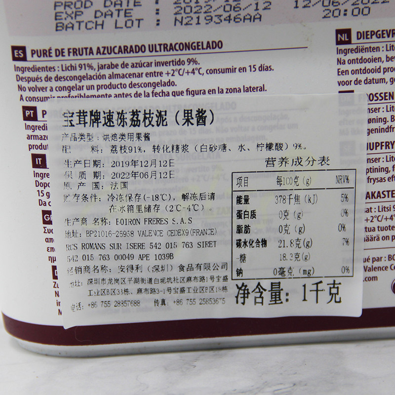 法国原装进口Boiron宝茸荔枝果溶果茸果泥1kg甜品面包蛋糕烘焙用