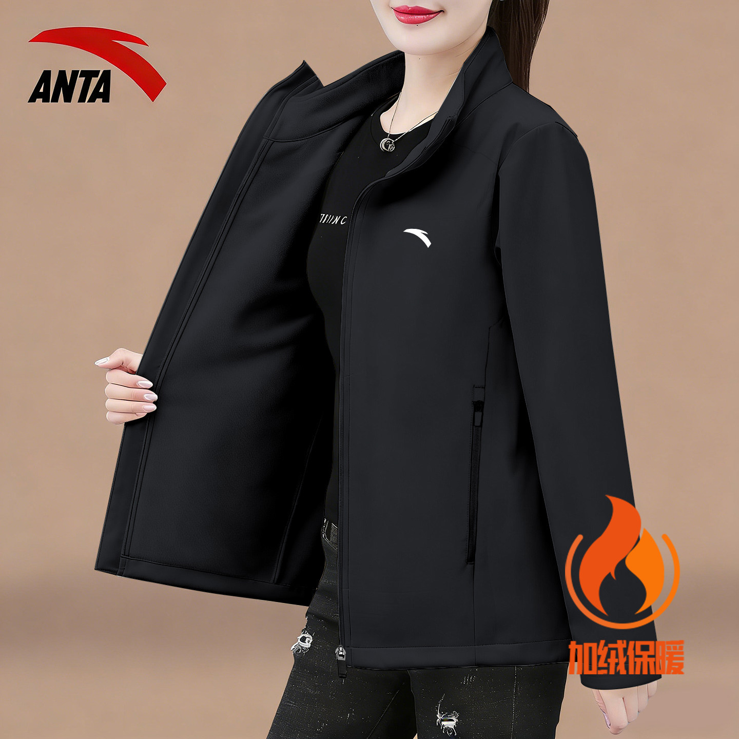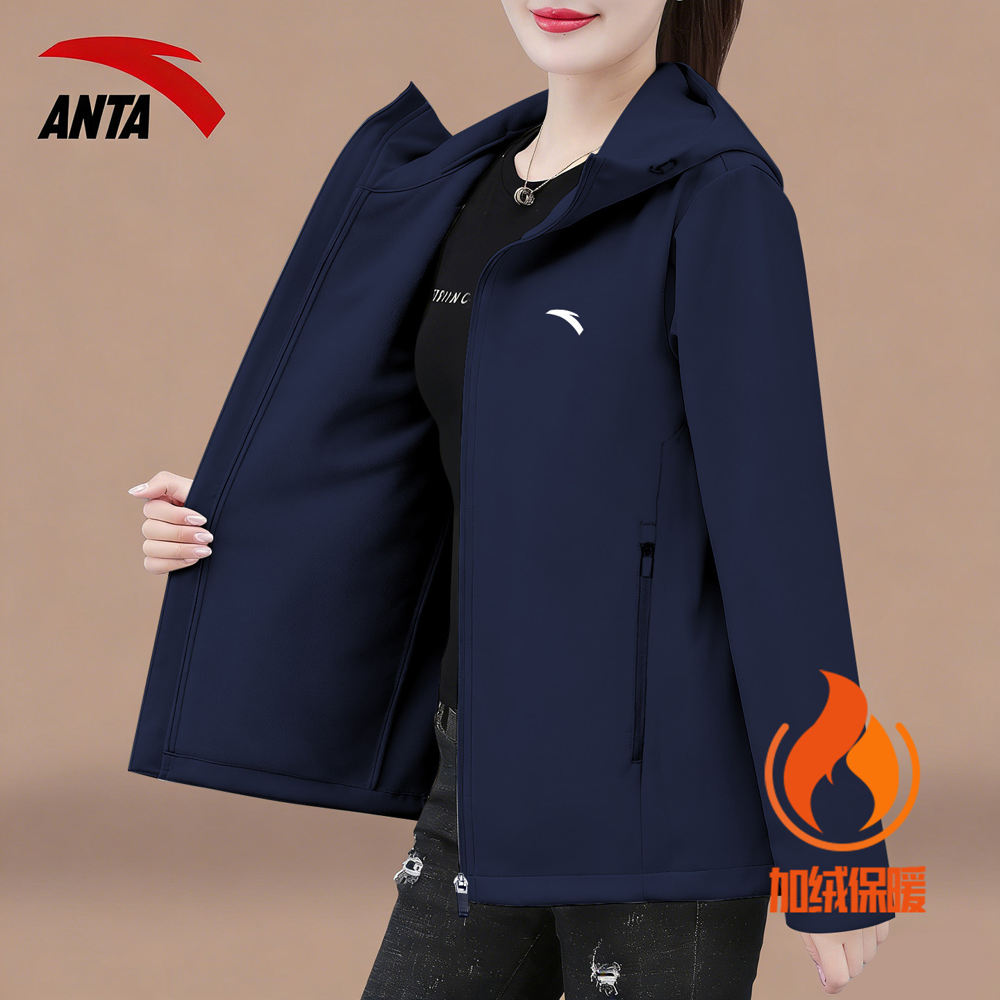 安踏冬季加绒保暖防风连帽外套女