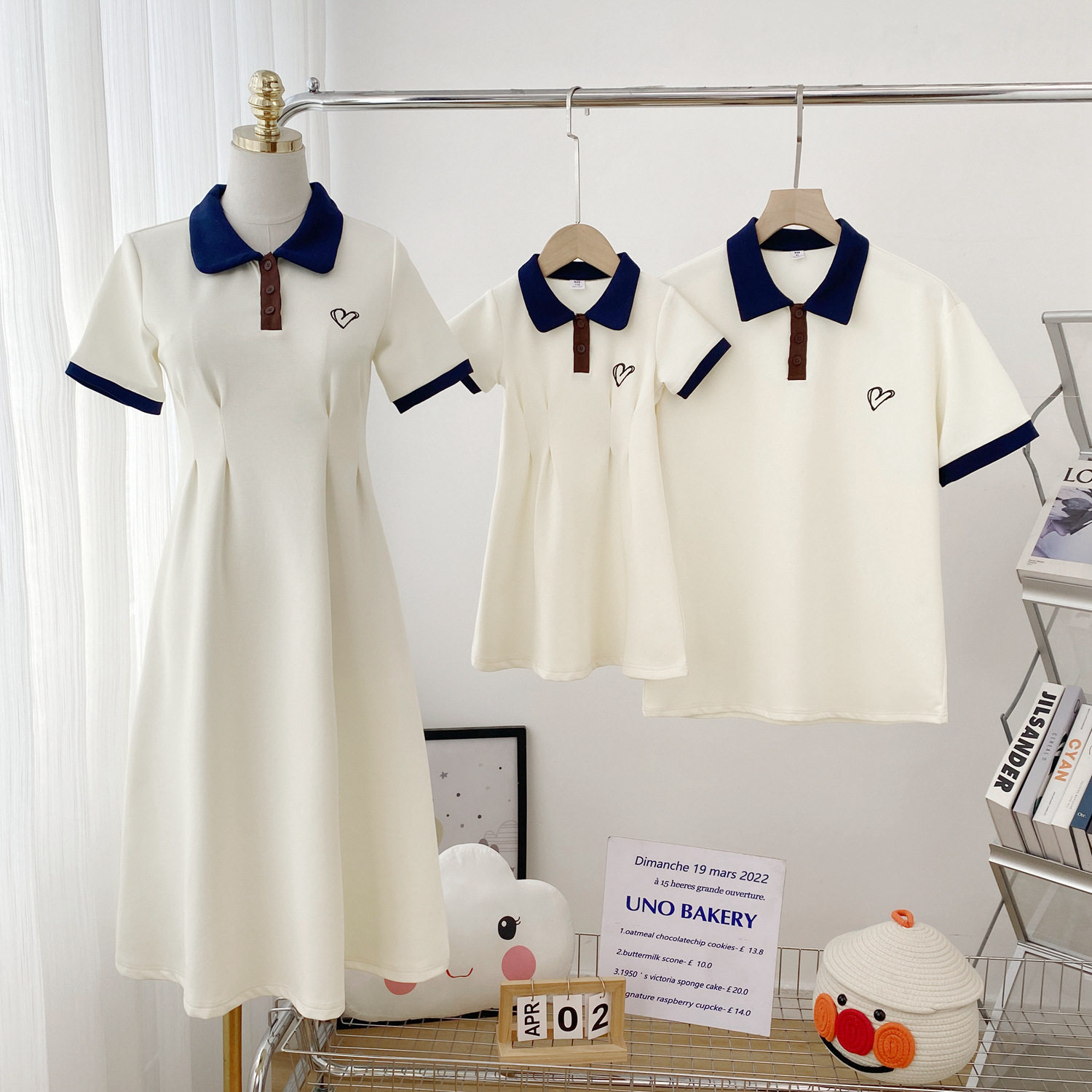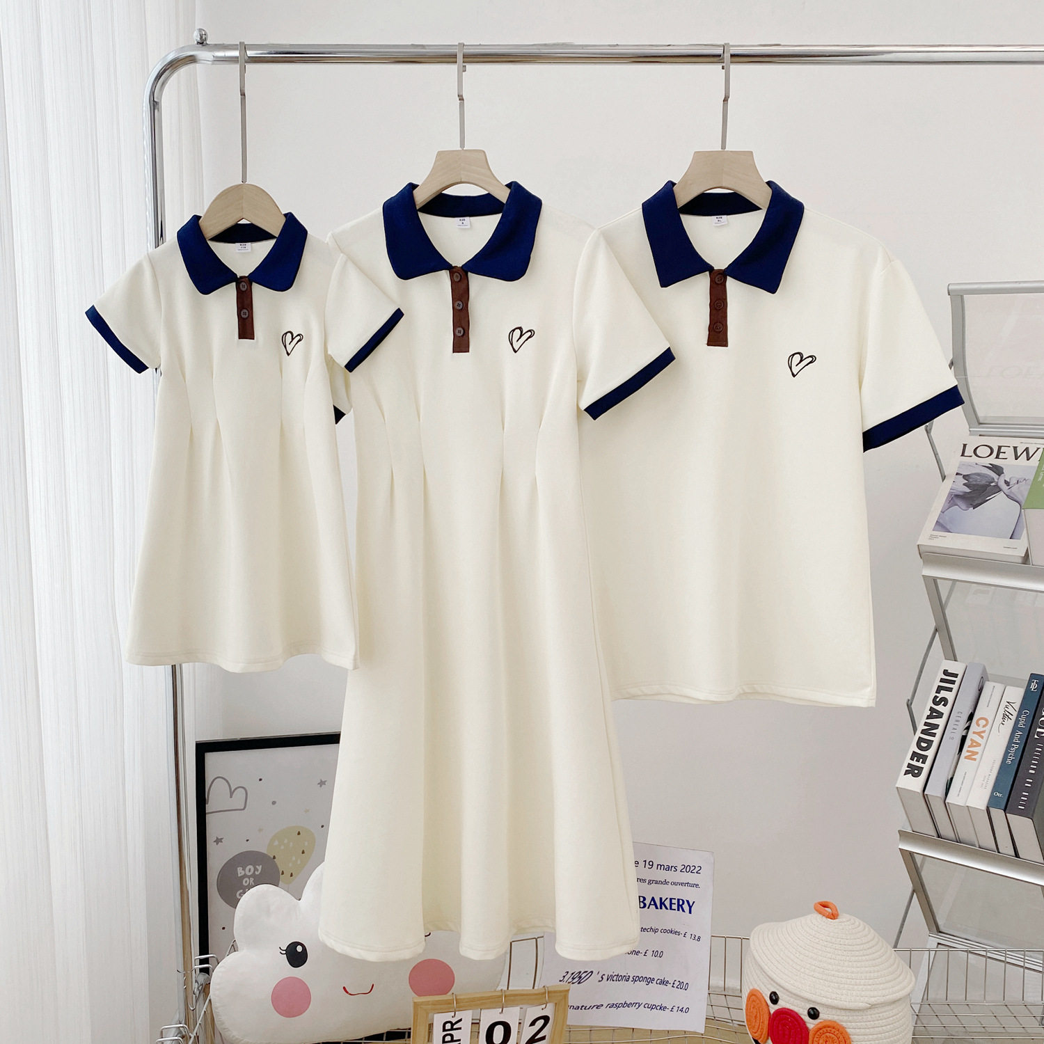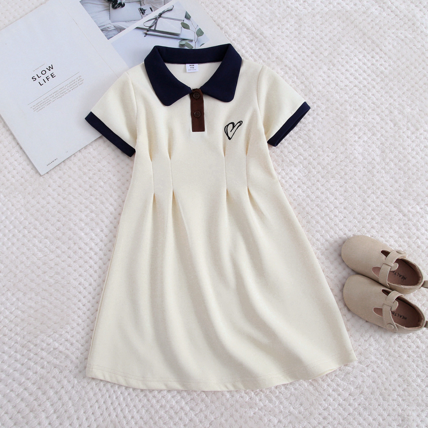 夏季新款杏色爱心刺绣收腰a字显瘦学院风减龄POLO短袖连衣裙亲子