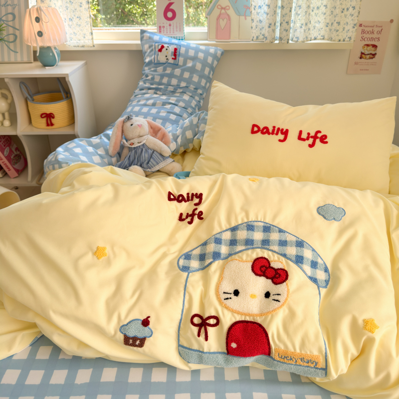 可爱kt猫水洗棉毛巾绣四件套非全棉纯棉被套床单人宿舍床上三件套