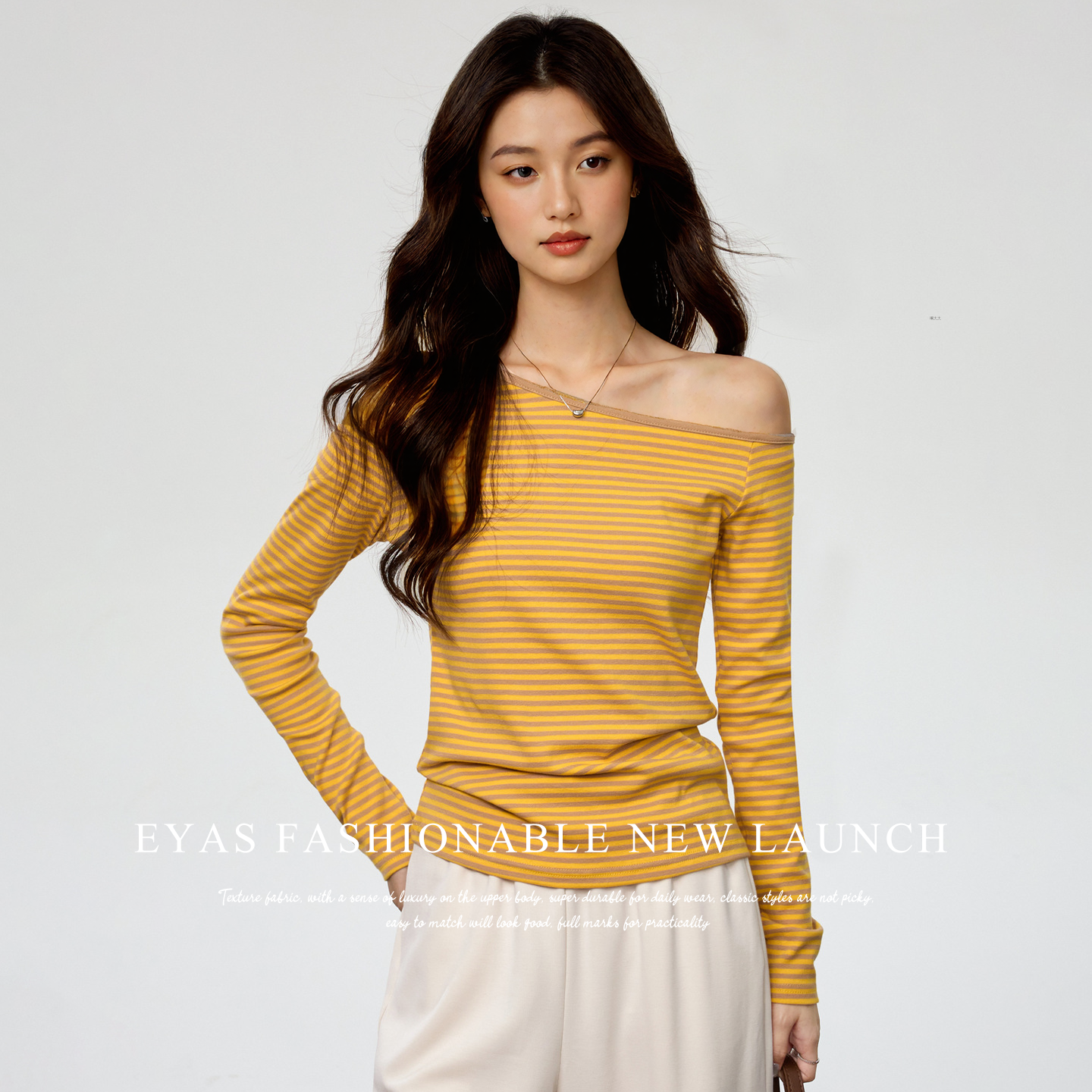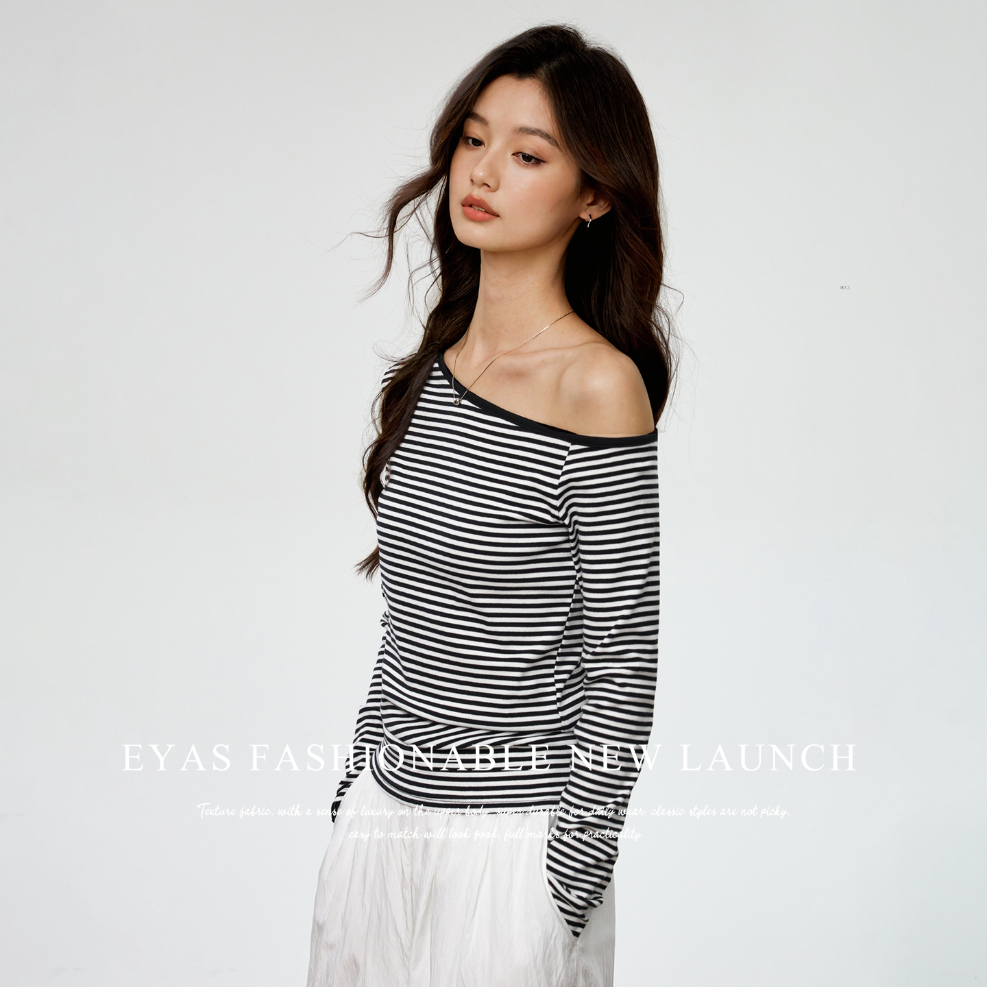 2025秋季新款女款百搭设计感一字领斜肩修身气质条纹长袖T恤上衣