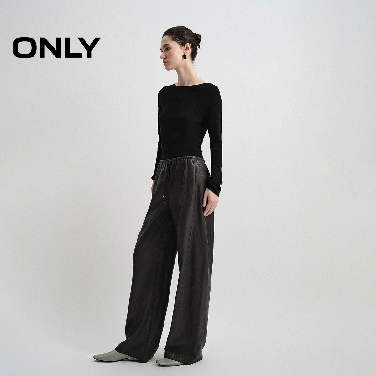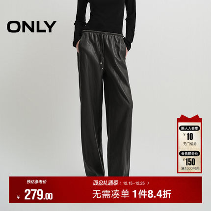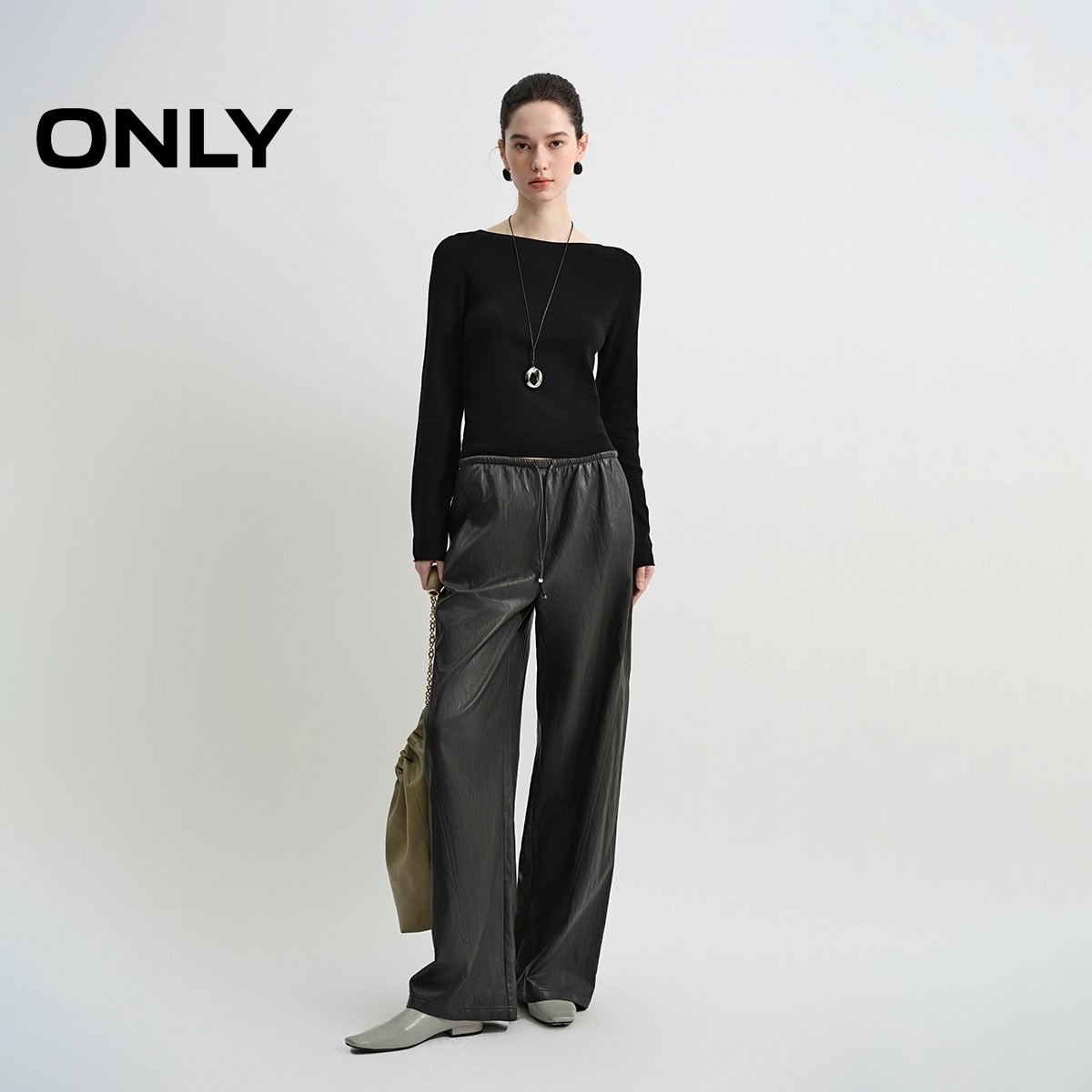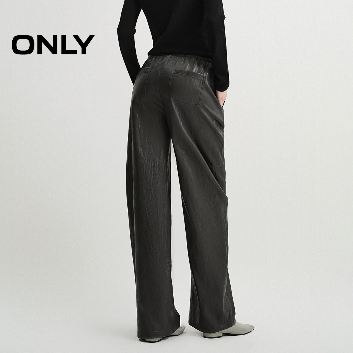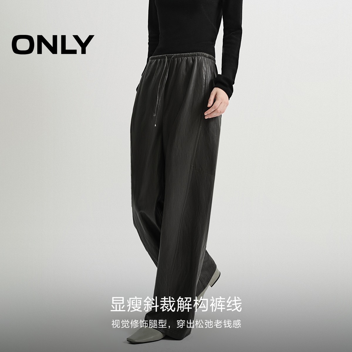 ONLY2025冬季新款质感肌理PU弹力抽绳腰身宽松直筒裤休闲裤女