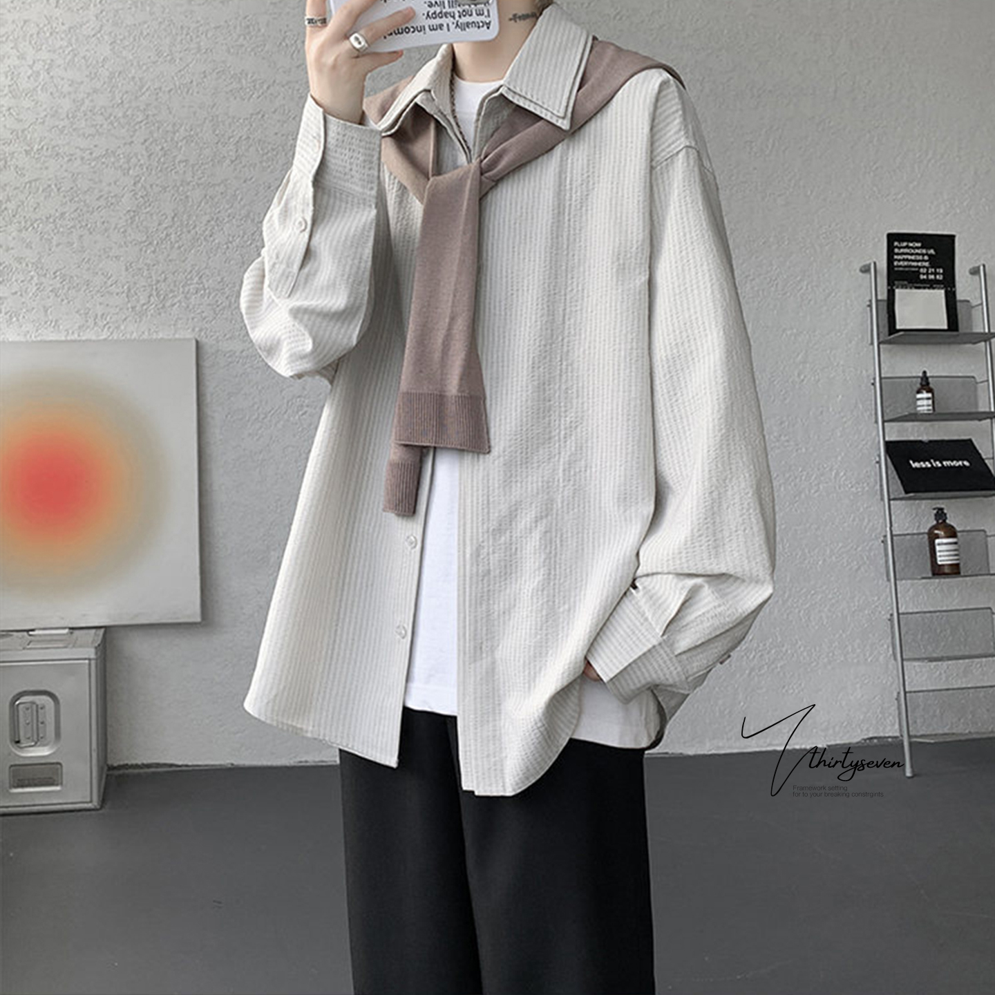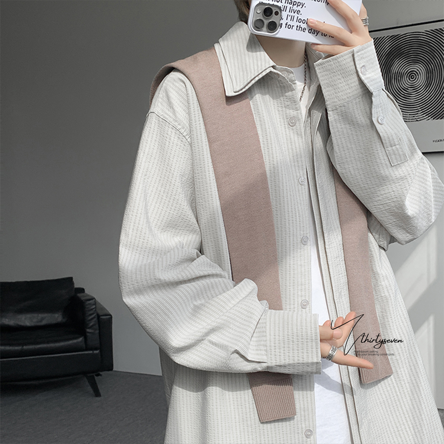 V37设计感小众披肩条纹衬衫男款秋季美式慵懒风翻领假两件衬衣潮