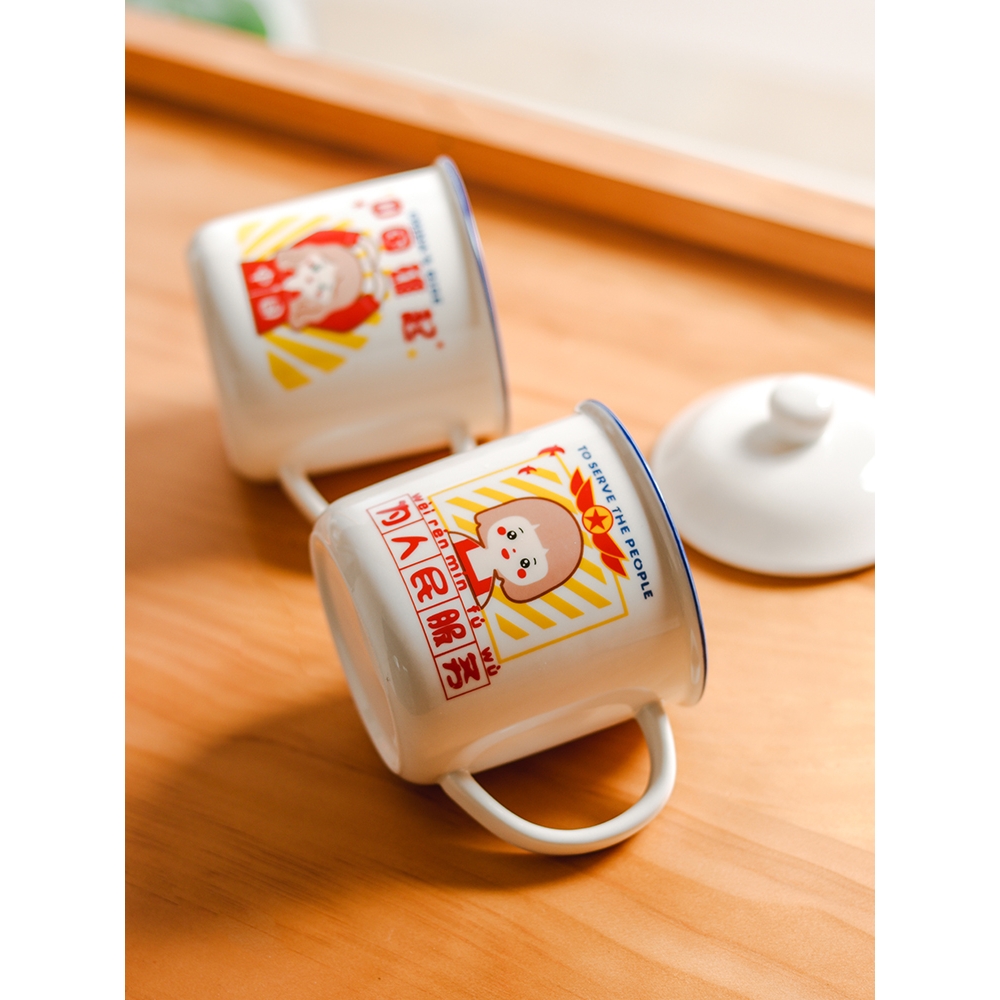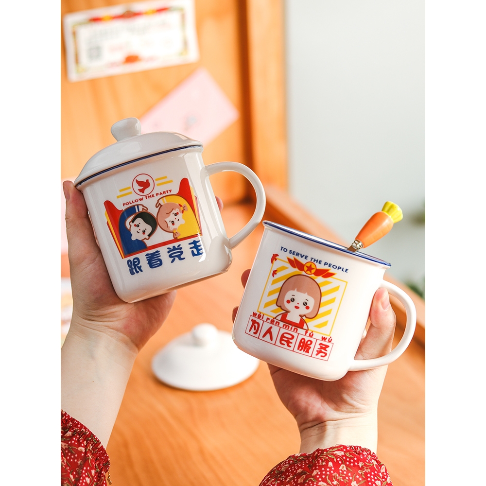 创意可爱复古陶瓷杯怀旧仿搪瓷杯子男女生马克杯带盖勺大容量凌月