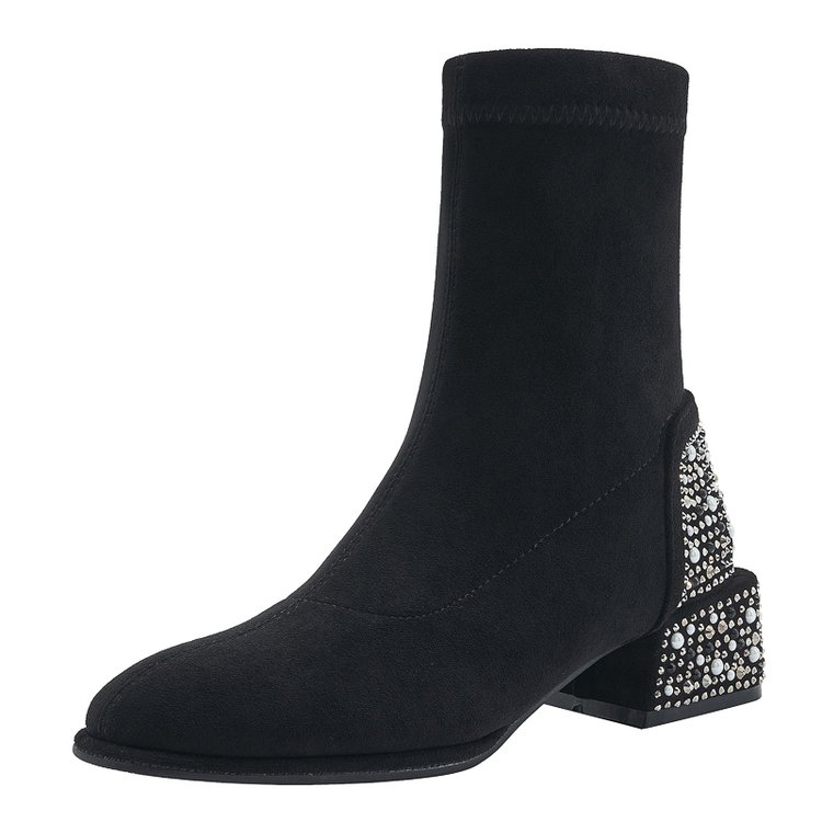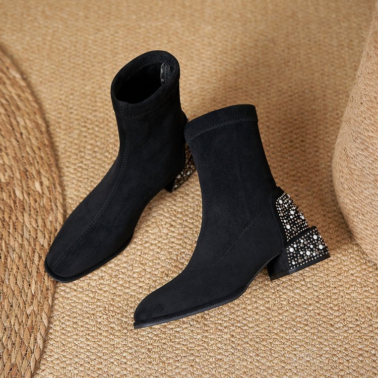 2025新款弹力短靴单靴女水钻女粗跟时尚马丁靴瘦瘦鞋百搭套筒女鞋