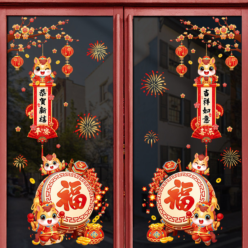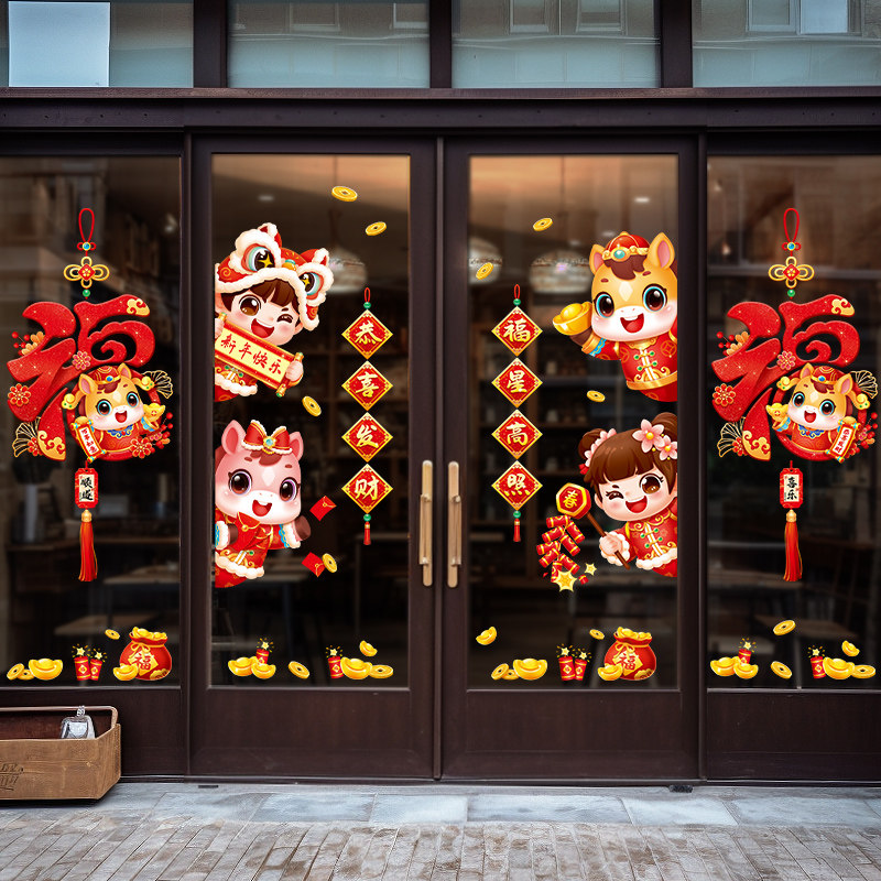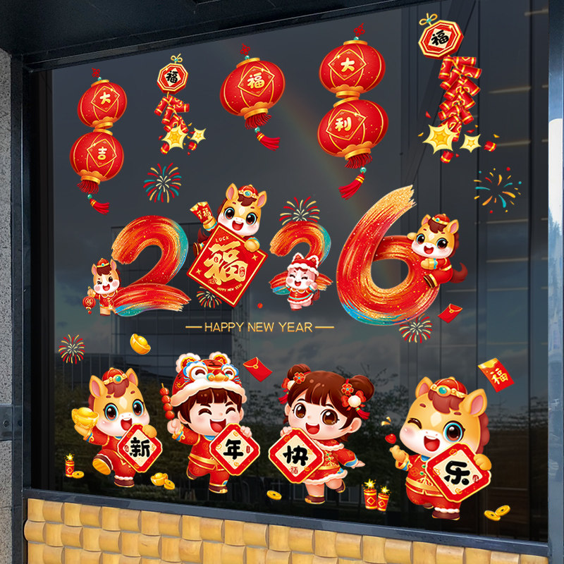2026新年装饰玻璃门贴纸马年门店场景布置过年氛围静电无胶窗贴画