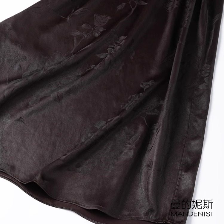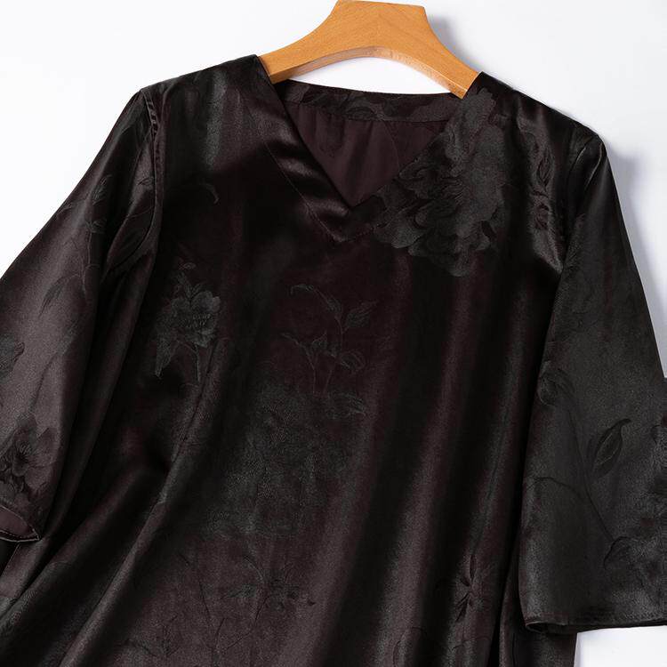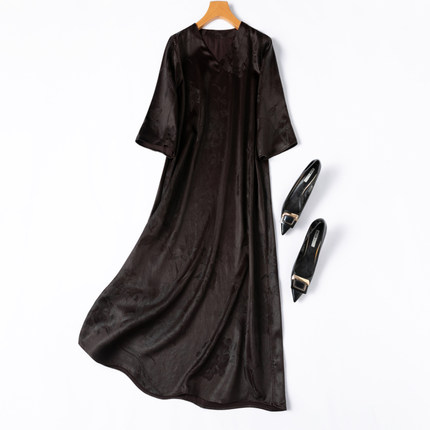 45姆米重缎提花香云纱!山水真丝V领七分袖宽松长款连衣裙皮子