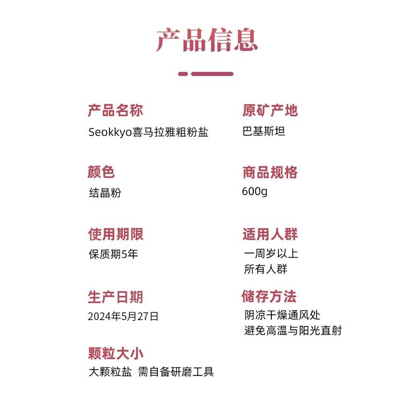 Seokkyo喜马拉雅盐玫瑰盐矿盐岩盐粉盐进口盐无抗结粗粒600g
