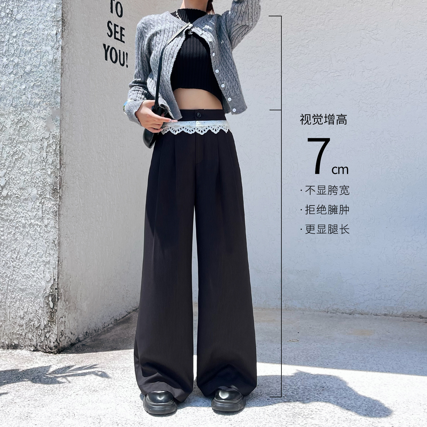 蕾丝拼接腰条纹阔腿裤女秋季气质宽松显瘦百搭通勤休闲拖地长裤子