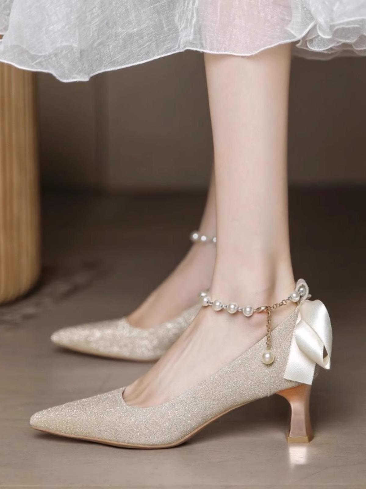 香槟色婚鞋新娘鞋不累脚主婚纱秀禾两穿一字扣玛丽珍高跟伴娘单鞋