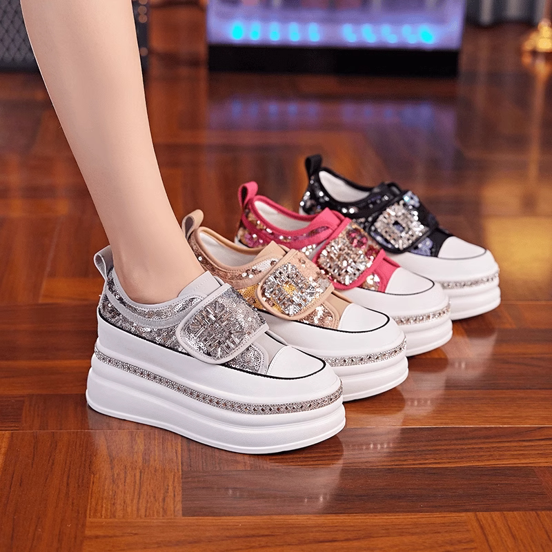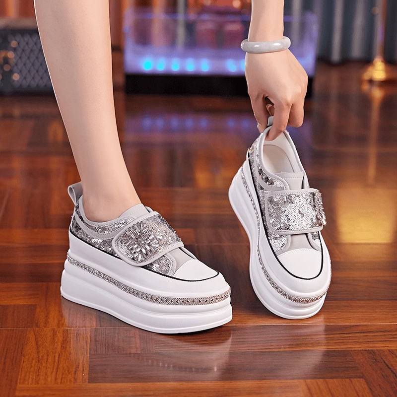 国风亮片内增高跟魔术贴浅口单鞋女2026夏季新款厚底一脚蹬休闲鞋