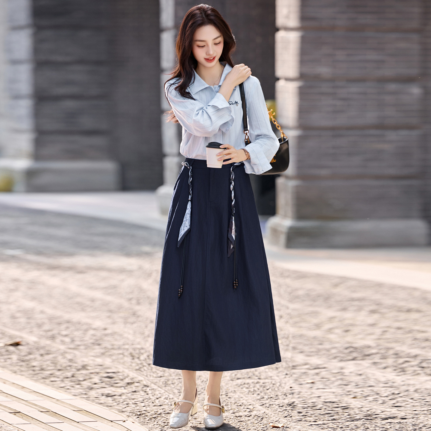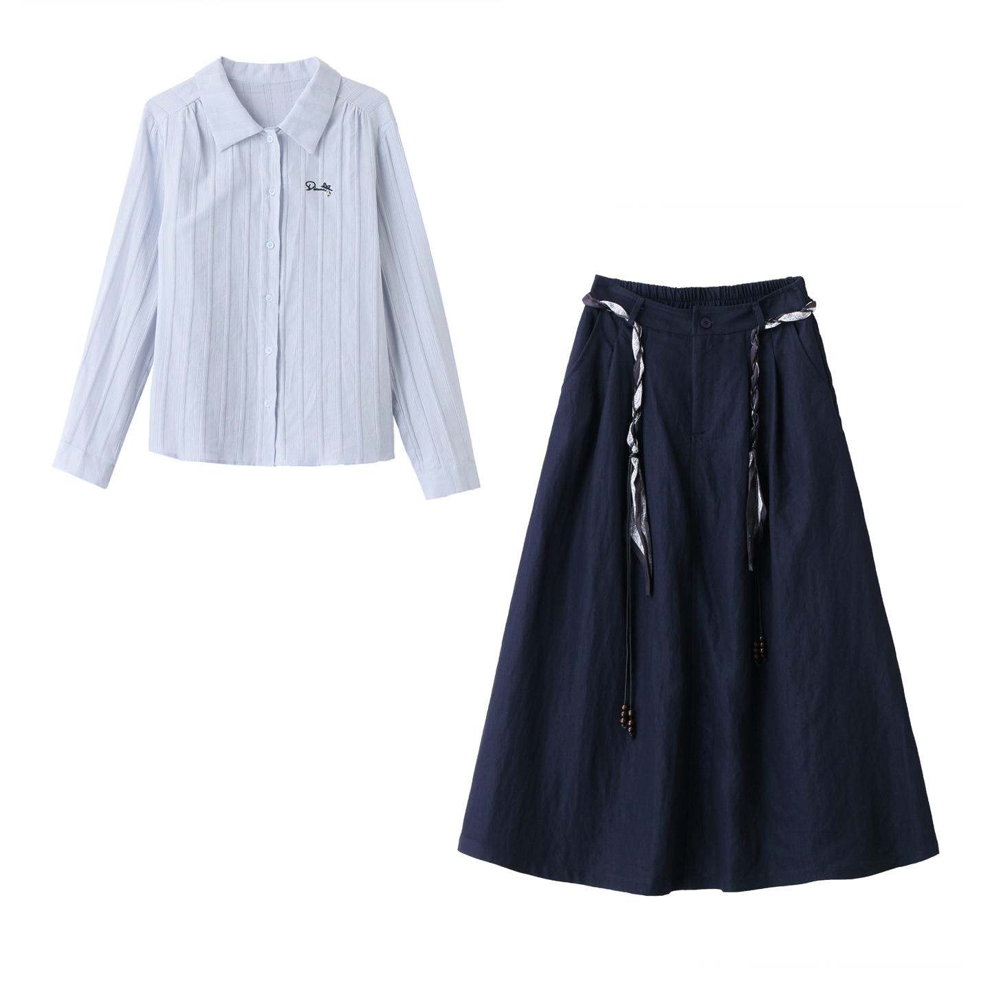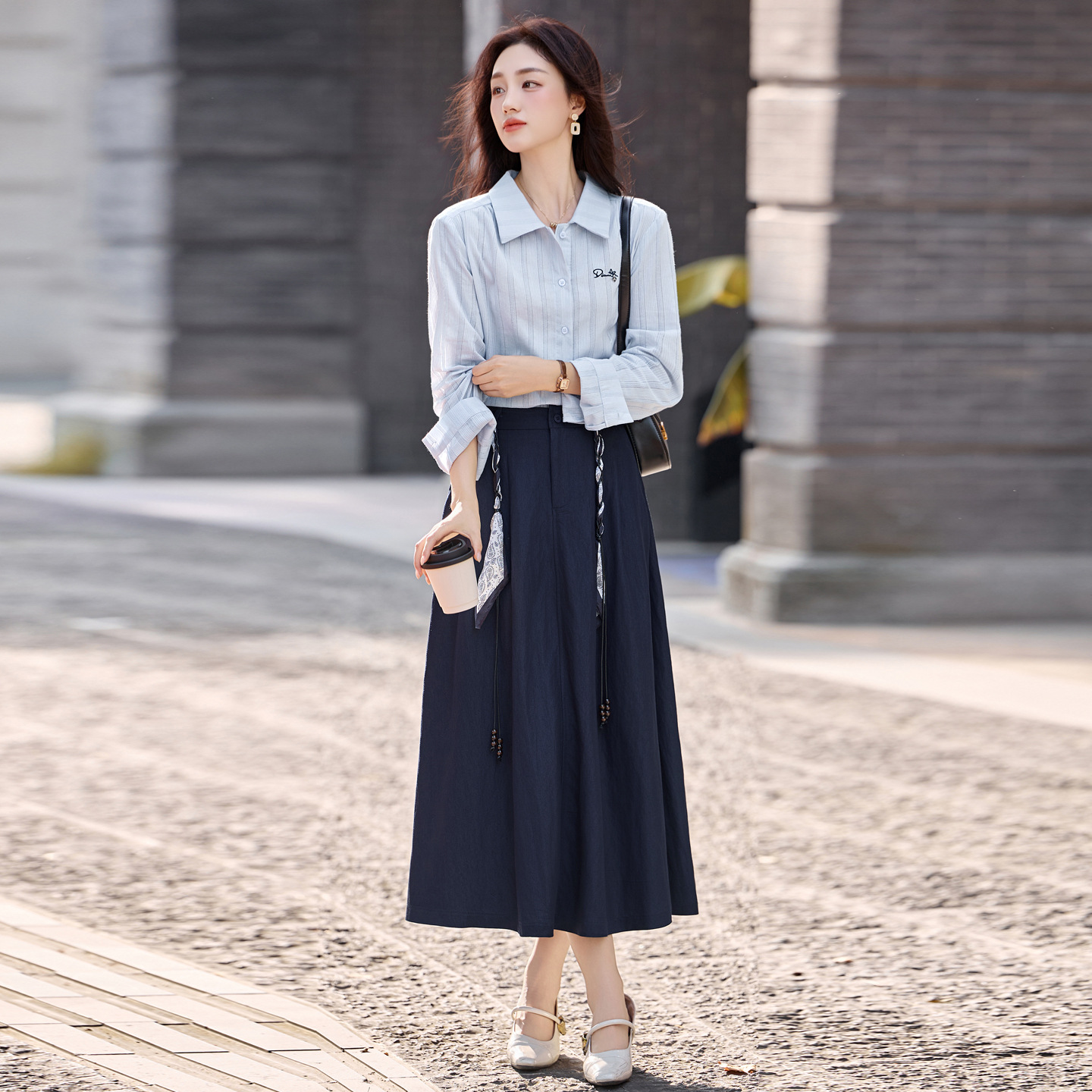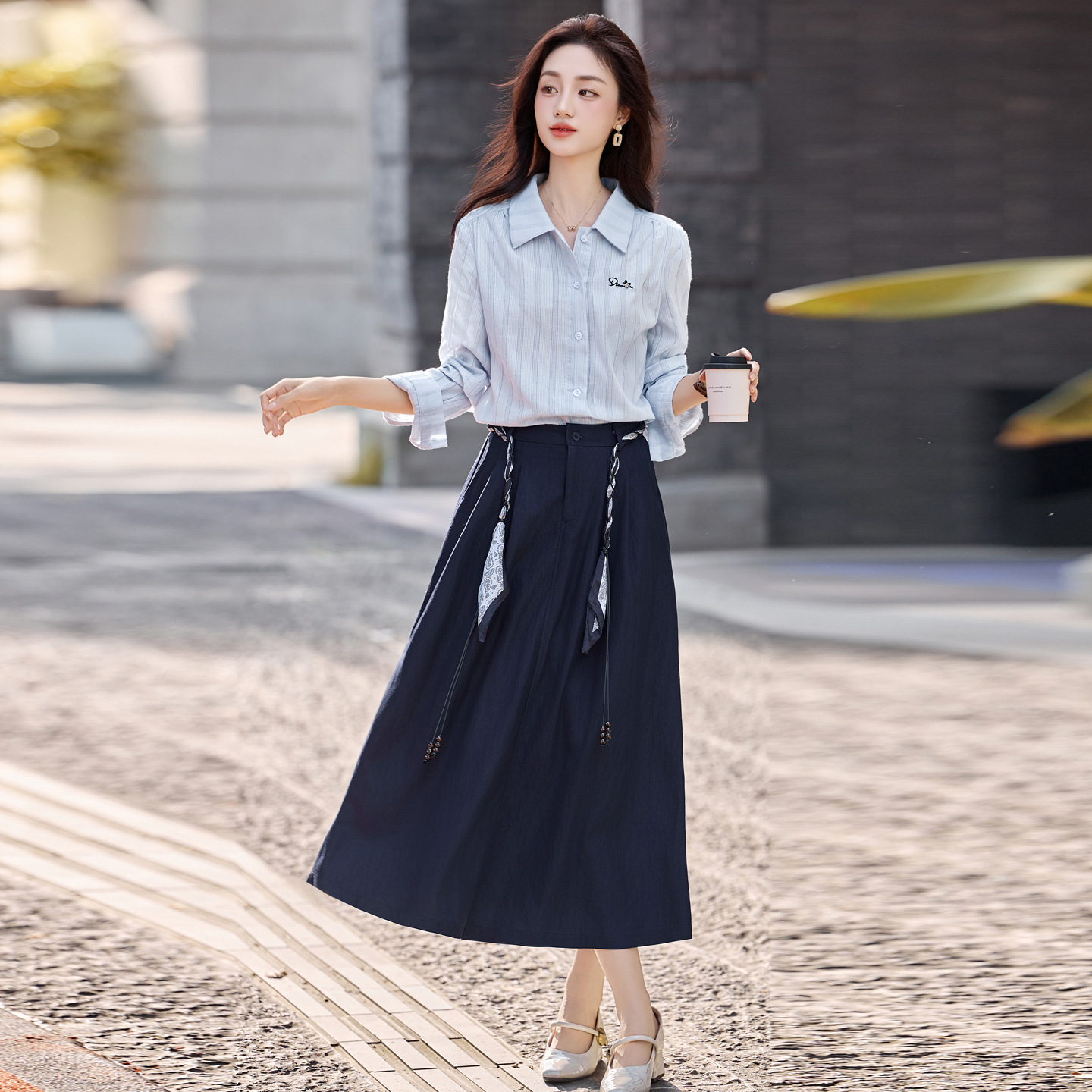她之蝶女装2025新款紫澜门高级感条纹衬衫半身裙两件套配腰带