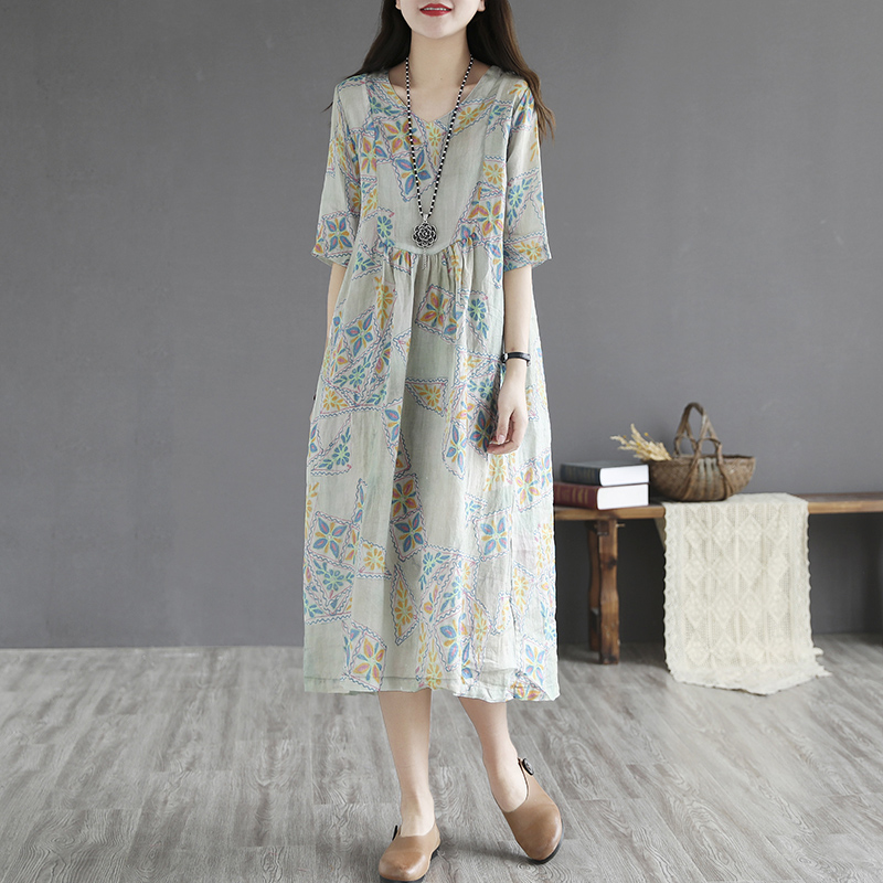 夏季新款苎麻V领碎花连衣裙女装文艺宽松显瘦透气中长款短袖裙子