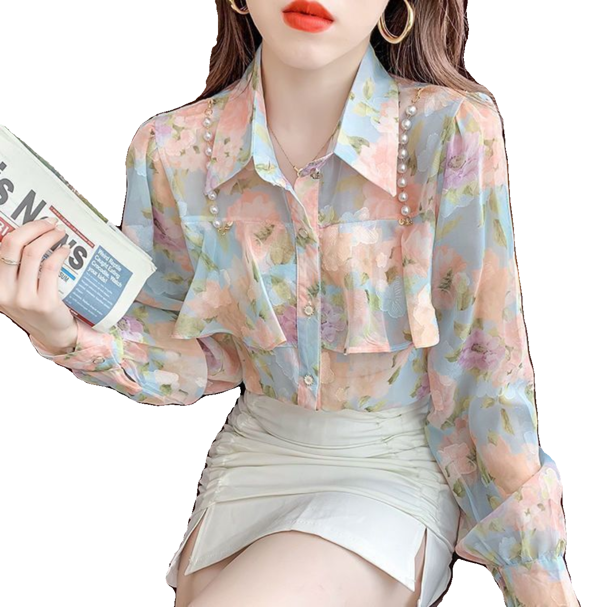 2025秋冬季新款洋气百搭设计感珍珠荷叶边碎花雪纺甜美长袖衬衣