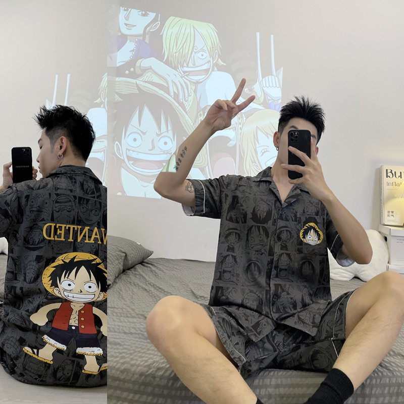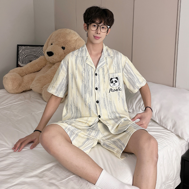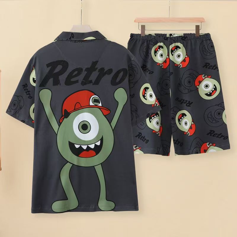 男士睡衣短袖睡衣男夏季开衫加肥加大码青少年卡通休闲家居服套装