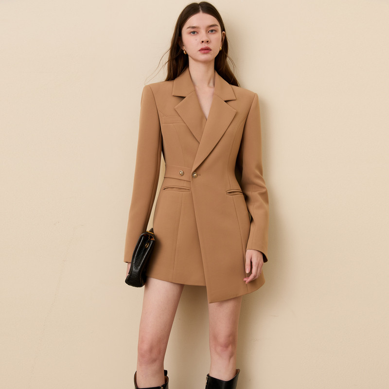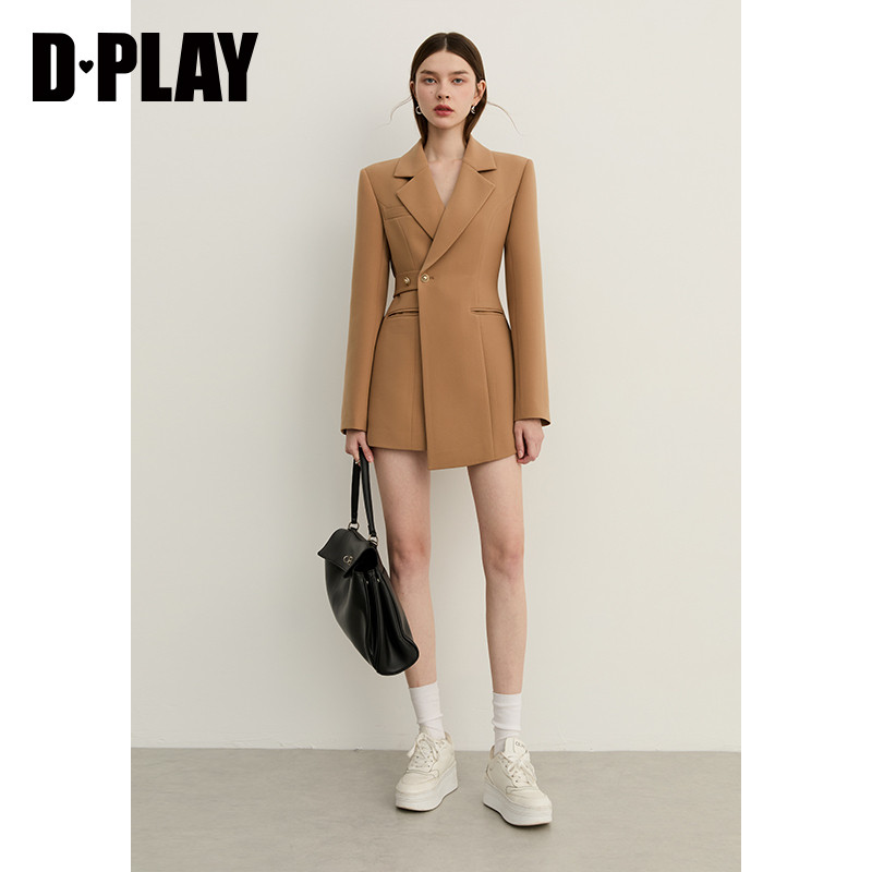 DPLAY卡其色翻领不对称收腰简约西装2026年气质通勤外套女
