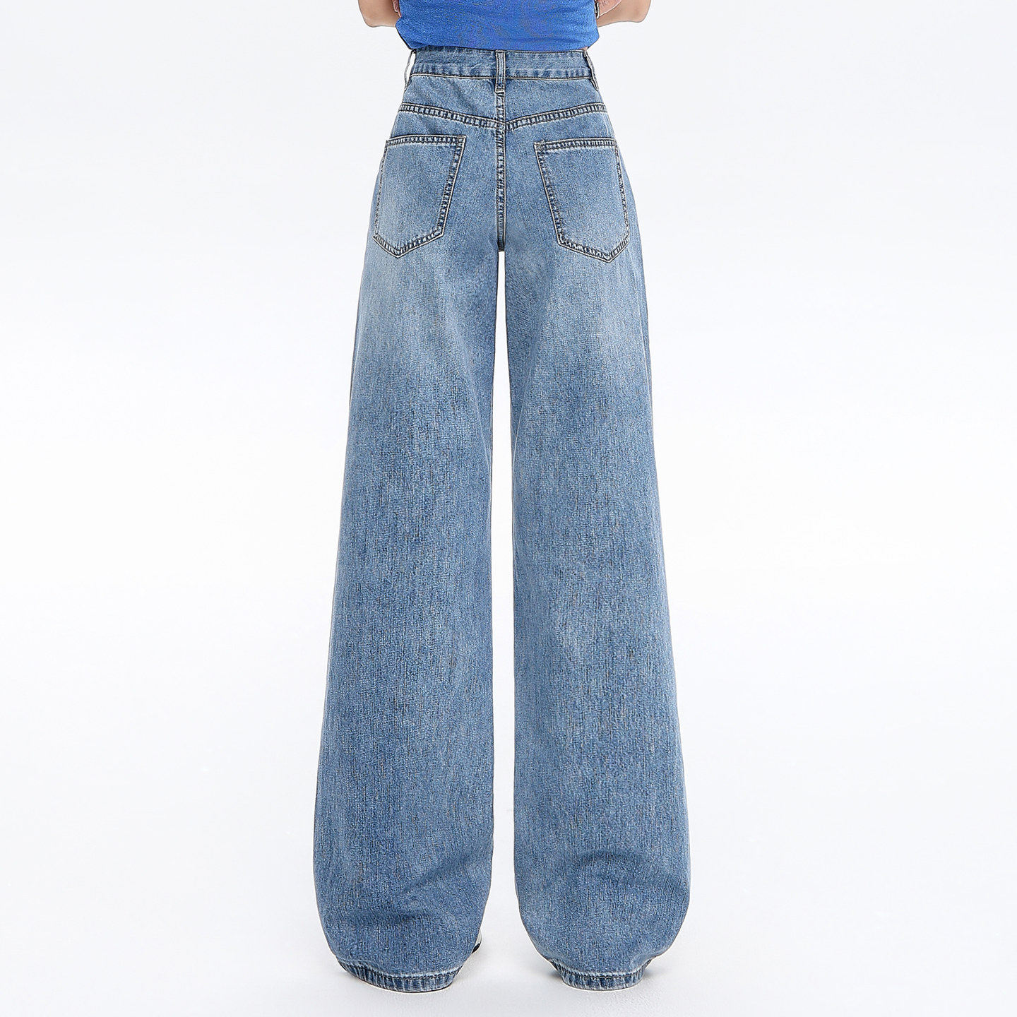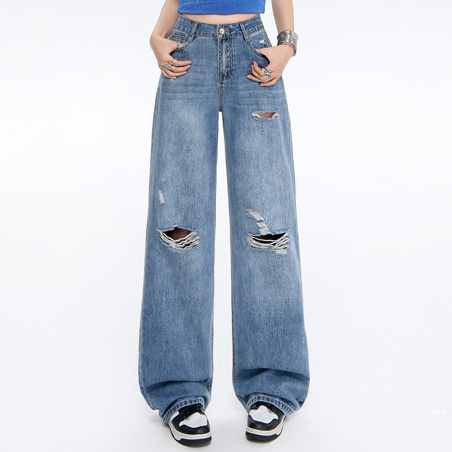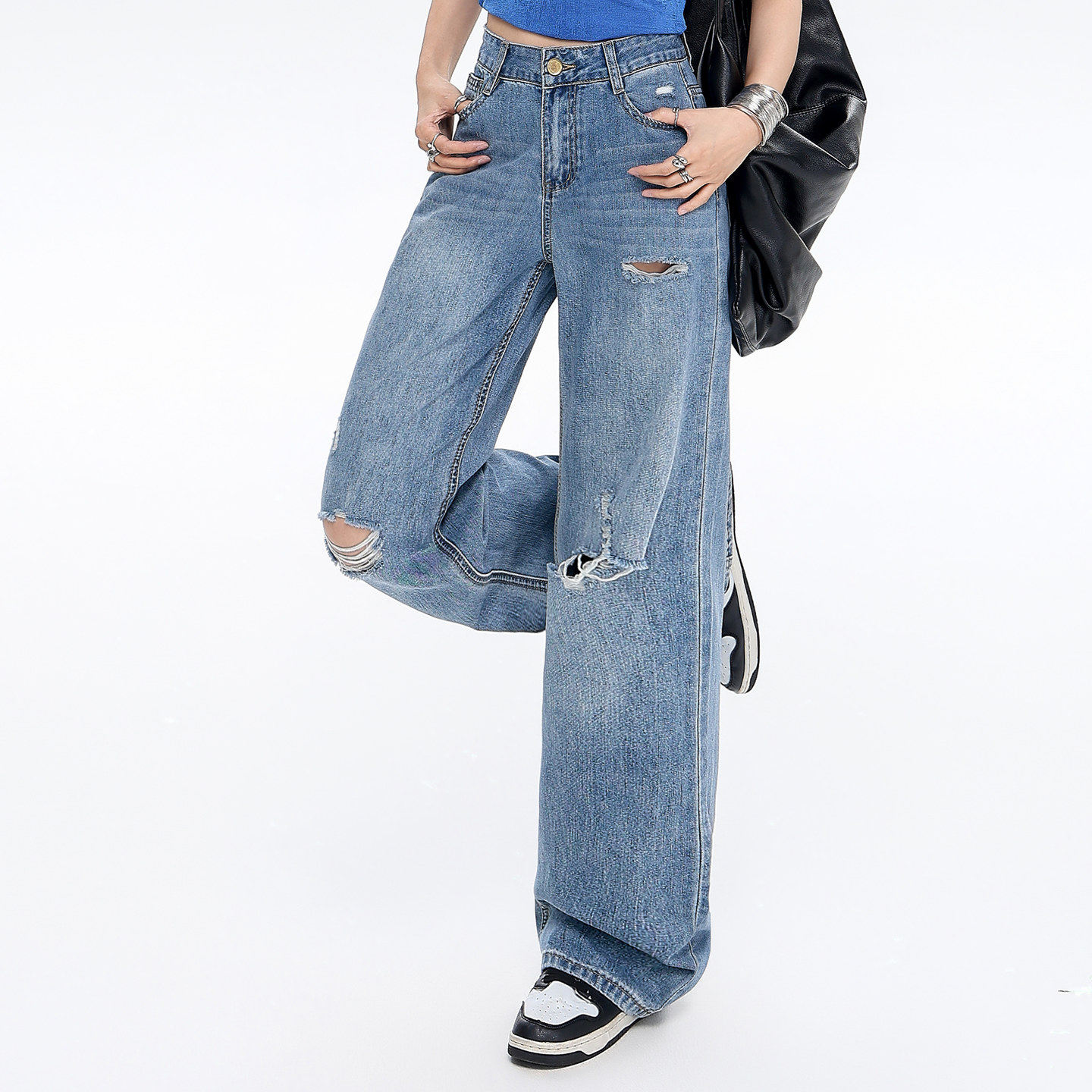 慵懒bf风破洞直筒牛仔裤女秋季新款美式复古垂感高腰阔腿拖地裤子