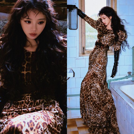 田曦薇同款衣服豹纹裙子长款长袖连衣裙轻奢高级感包臀裙2026爆款