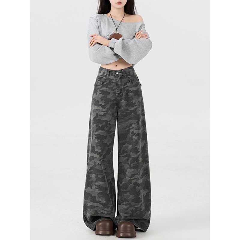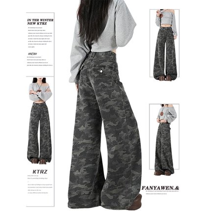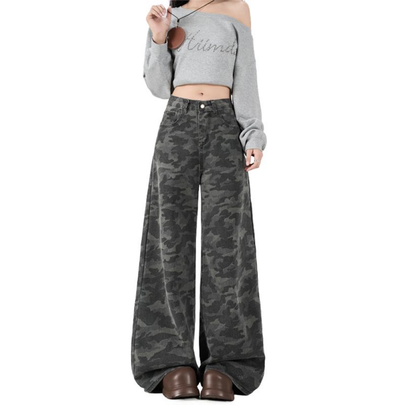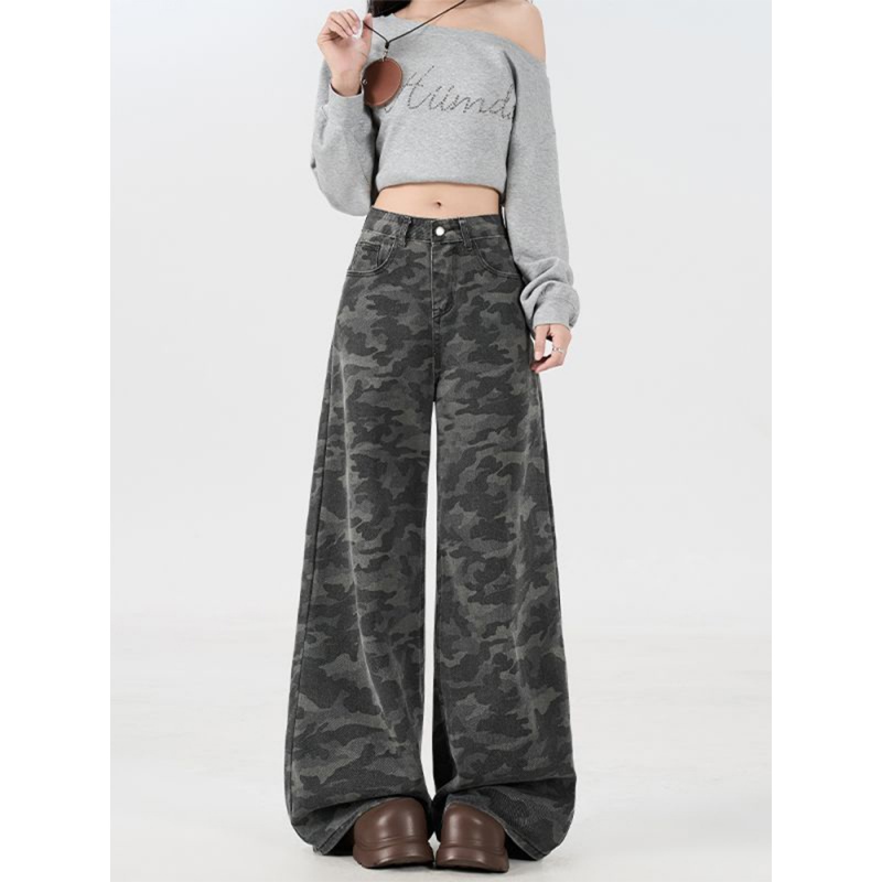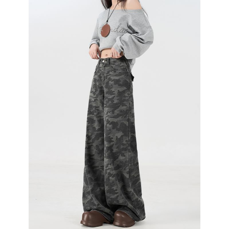 大码美式复古迷彩阔腿牛仔裤女秋季高街垂感宽松直筒工装显瘦裤子