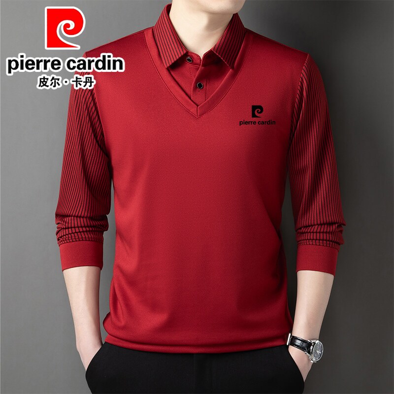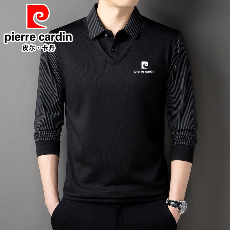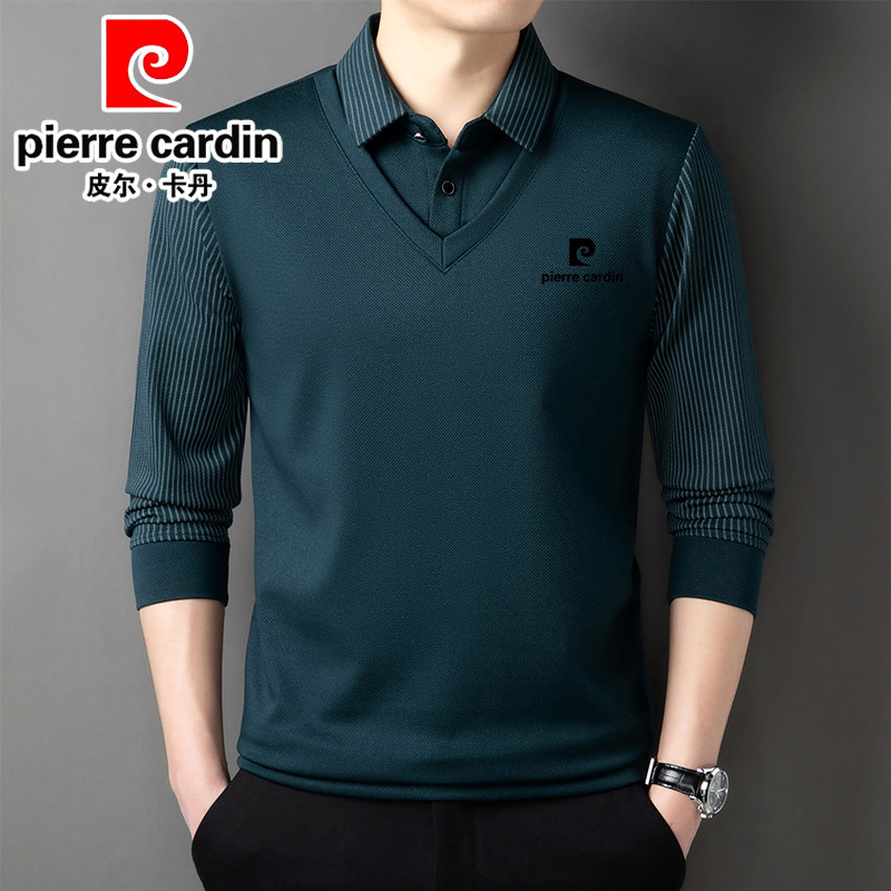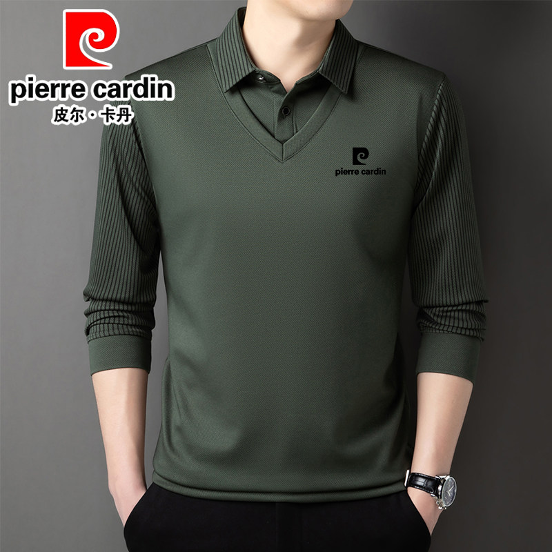 皮尔卡丹桑蚕丝羊绒假两件男士长袖t恤秋冬新款加绒衬衫领卫衣男