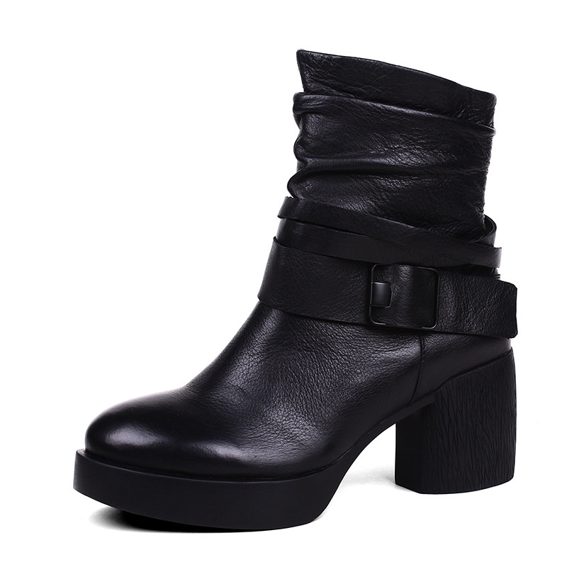 如影原创新款欧美风复古粗跟短靴女高端定制高跟女靴子皮带扣裸靴