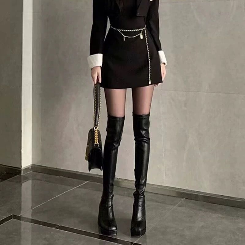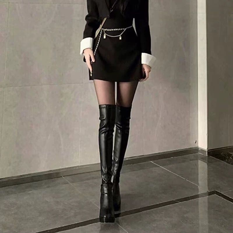 黑色过膝长筒靴女2024年秋新款粗跟防水台高筒靴小个子百搭弹力靴