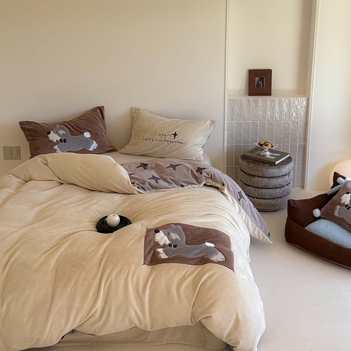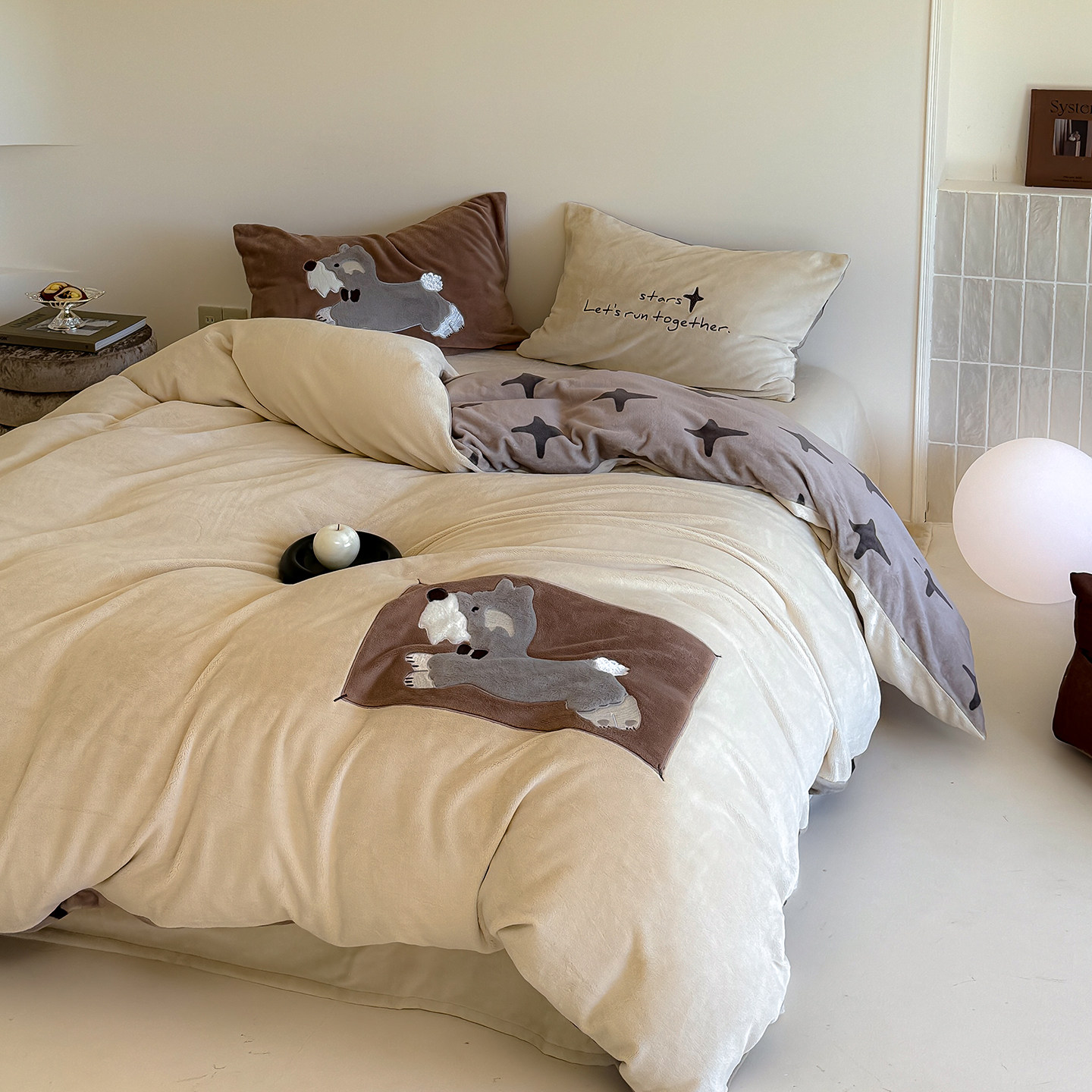 简约小清新230g全消光牛奶绒小狗刺绣四件套秋冬保暖珊瑚绒床笠
