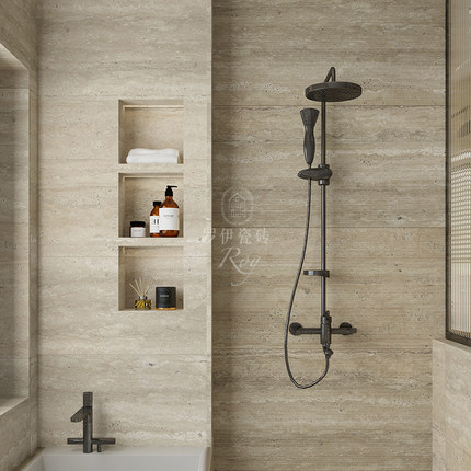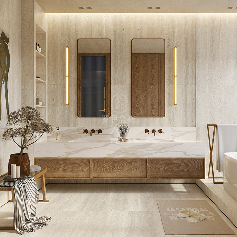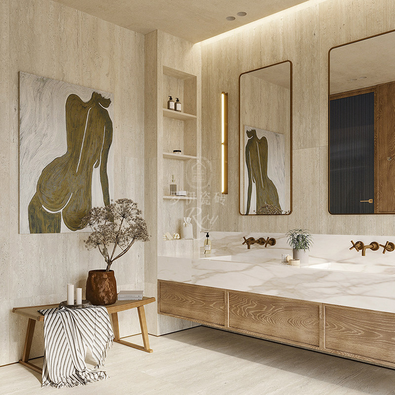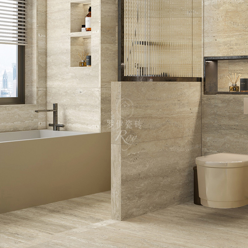 高端轻奢米黄色洞石瓷砖别墅客厅仿大理石地砖防滑化妆室壁砖背景