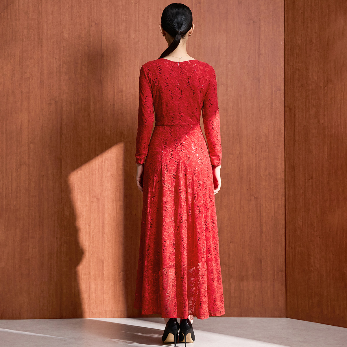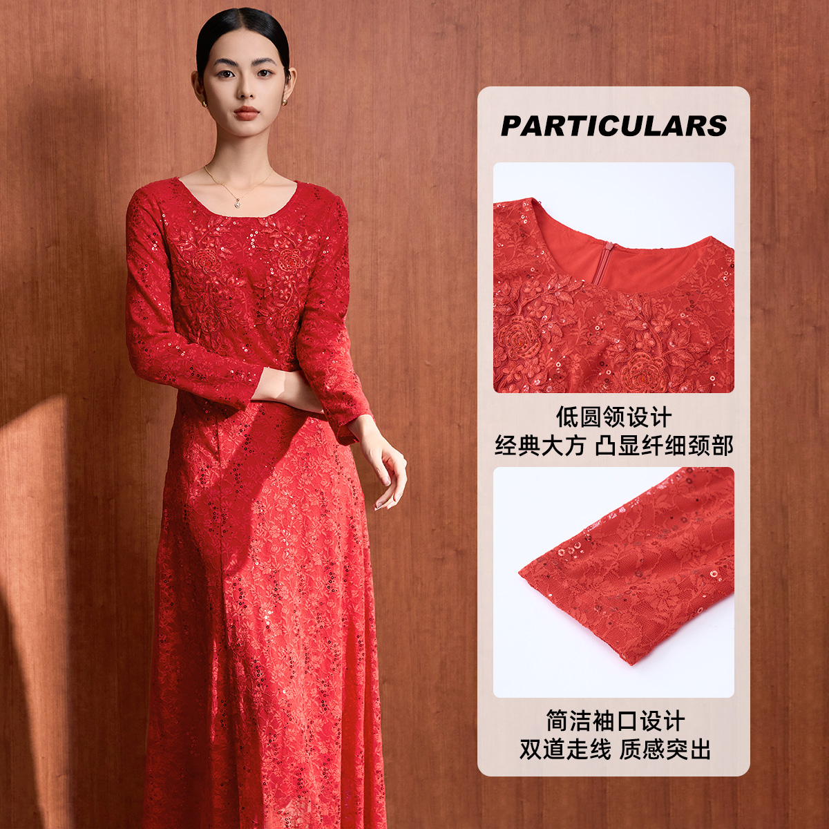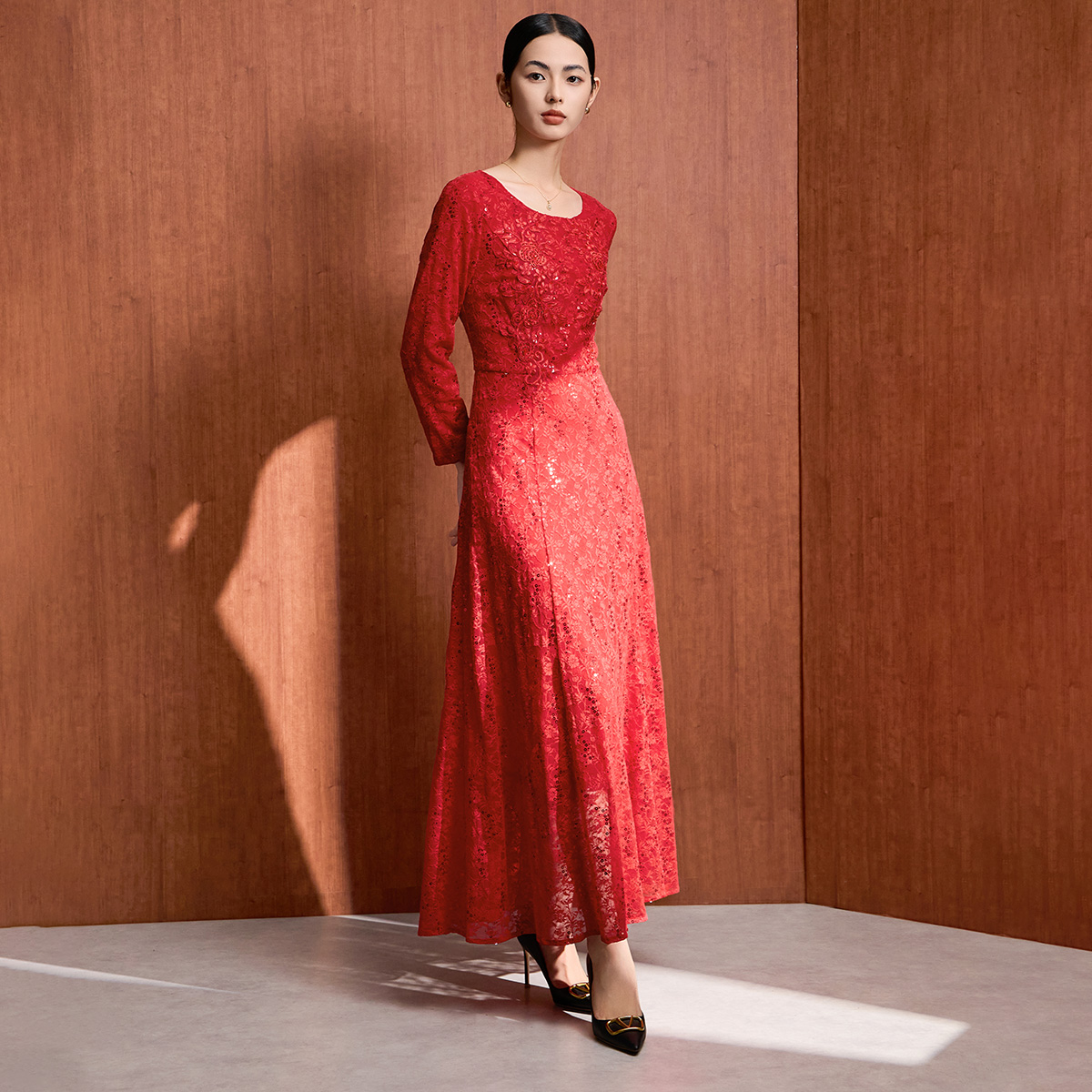 马天奴春秋新款红色蕾丝绣花连衣裙收腰气质高级长裙洋气礼裙子