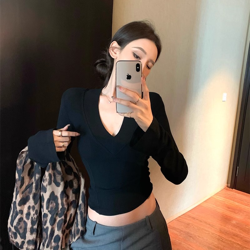 纯欲辣妹v领长袖t恤女秋冬上衣女