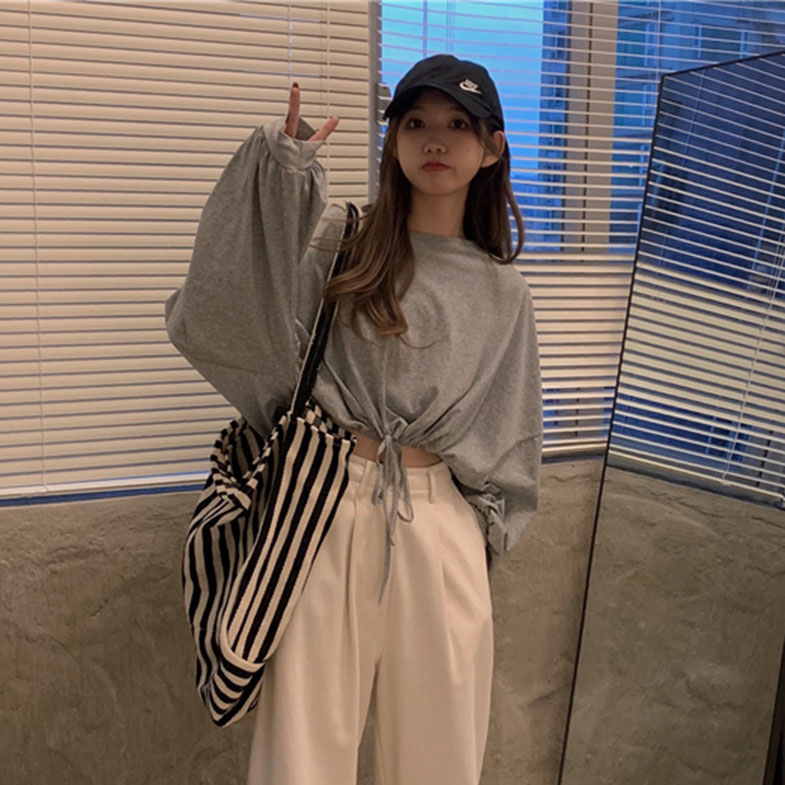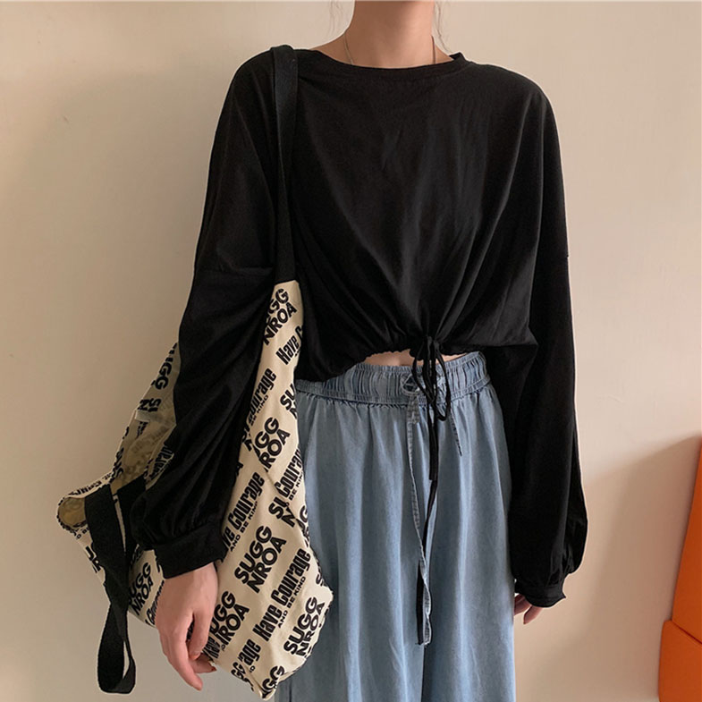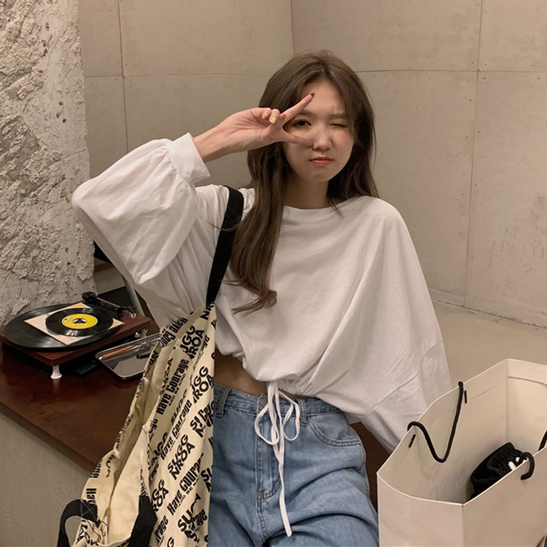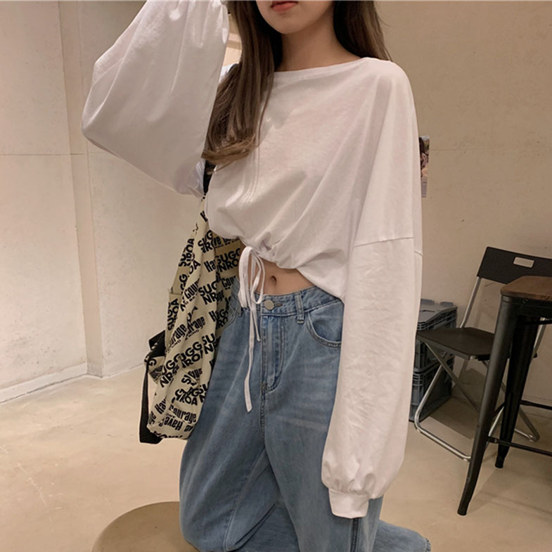 露脐短款宽松大码抽绳长袖爵士风格女装kpop跳舞衣服甜辣妹上衣秋