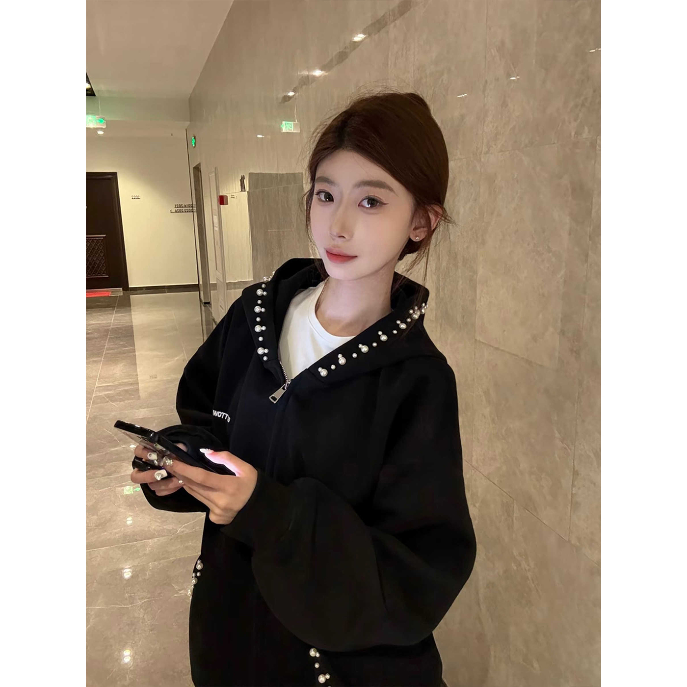 美式复古字母刺绣连帽卫衣女春秋季慵懒chic大童初中高中学生外套