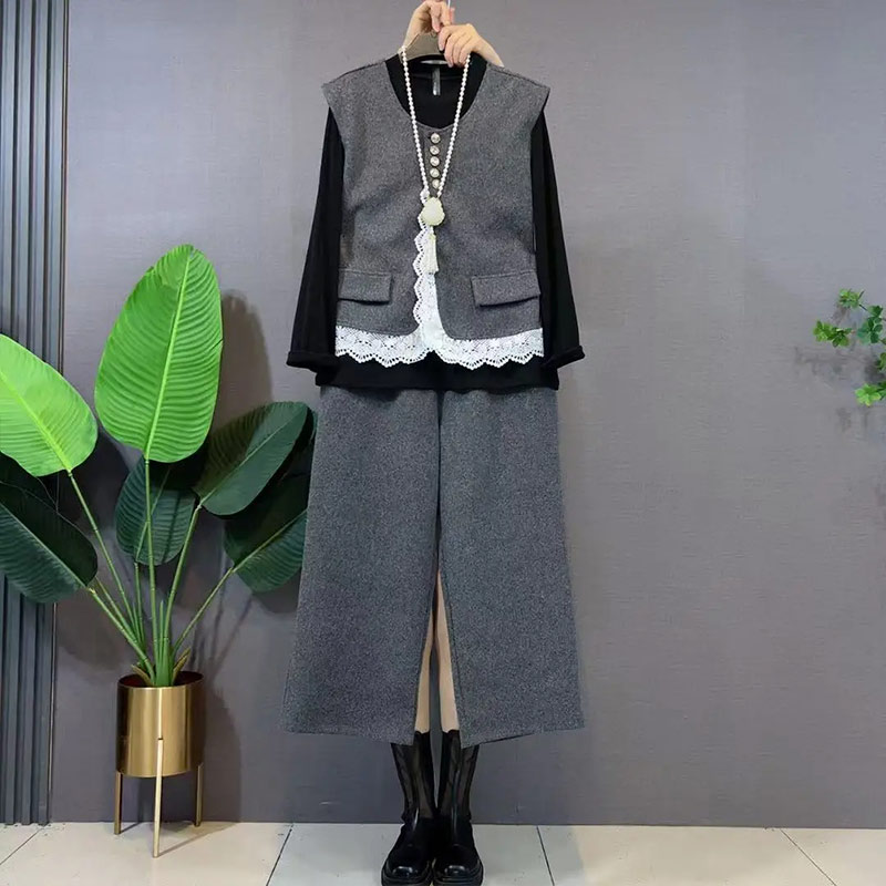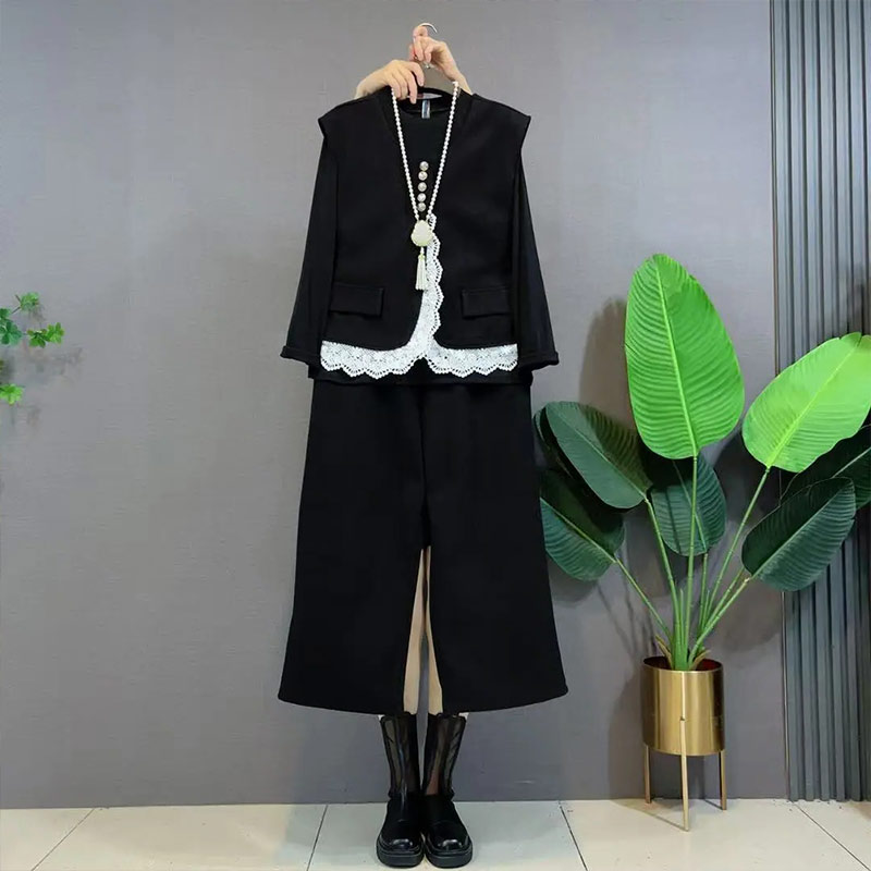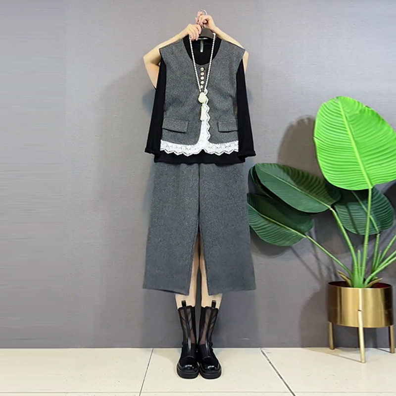 胖妹妹加肥拼接蕾丝边马甲打底衫阔腿裤子加肥大码女装毛呢三件套