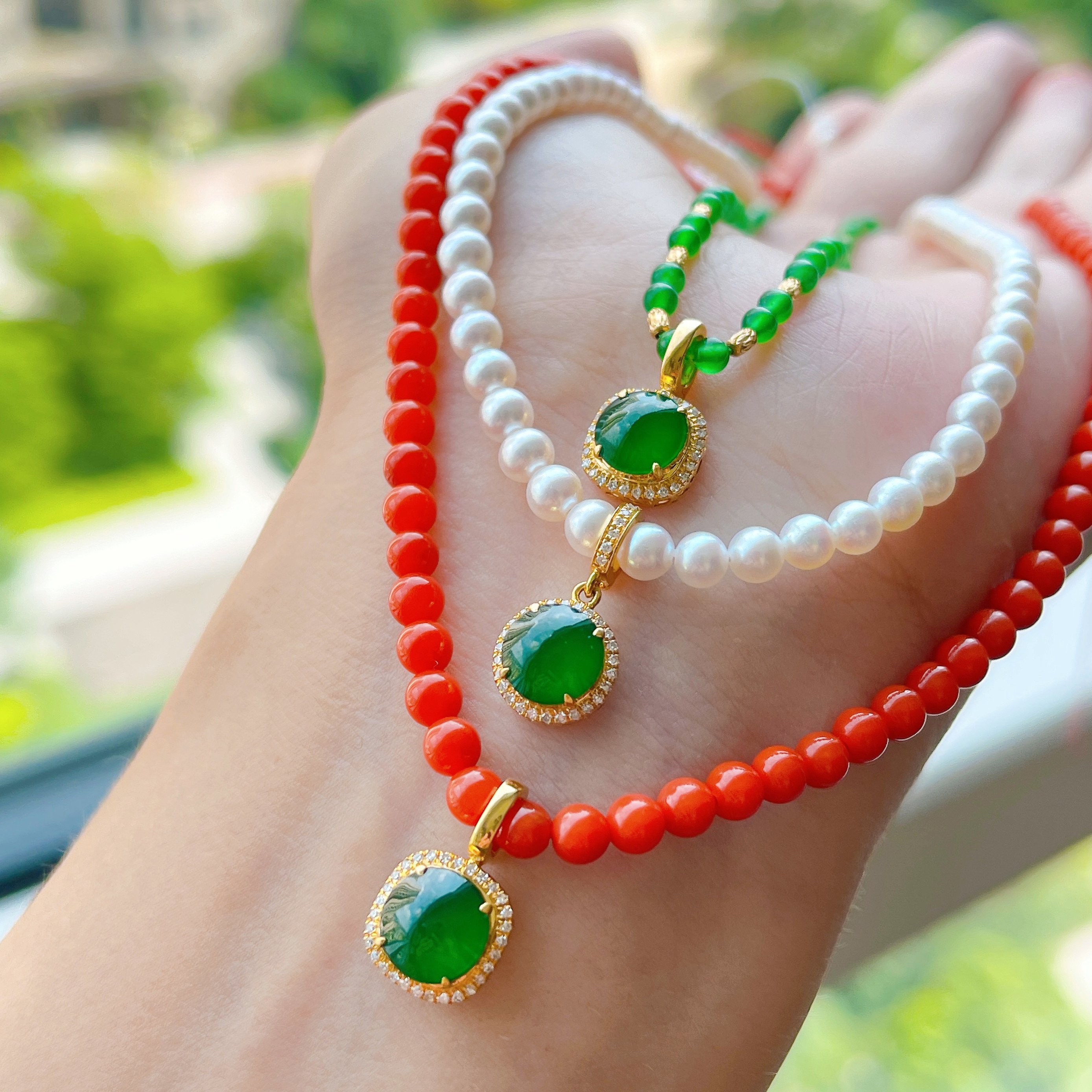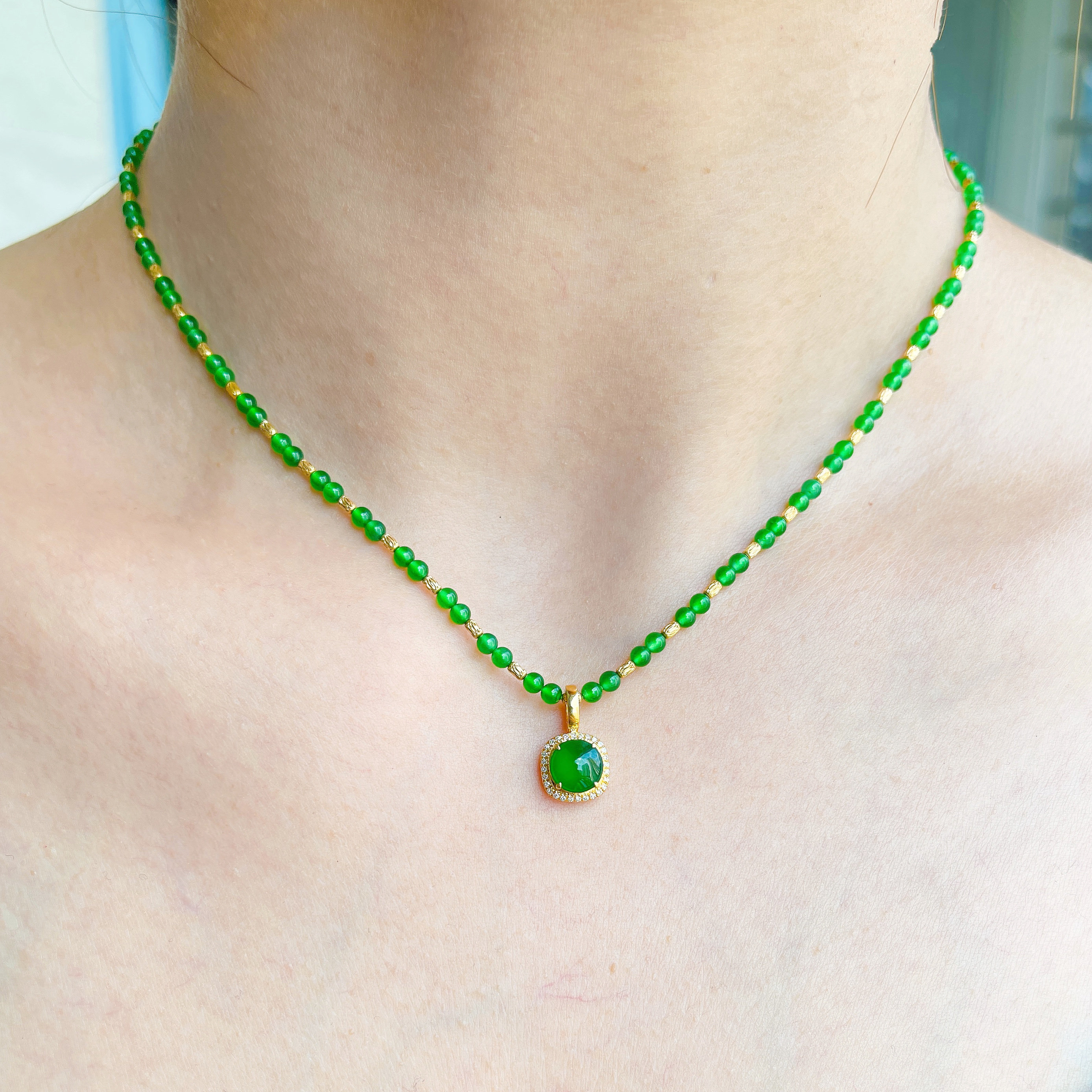 天然高冰种辣阳绿色翡翠蛋面18k黄金吊坠锁骨项链手串配件可叠戴