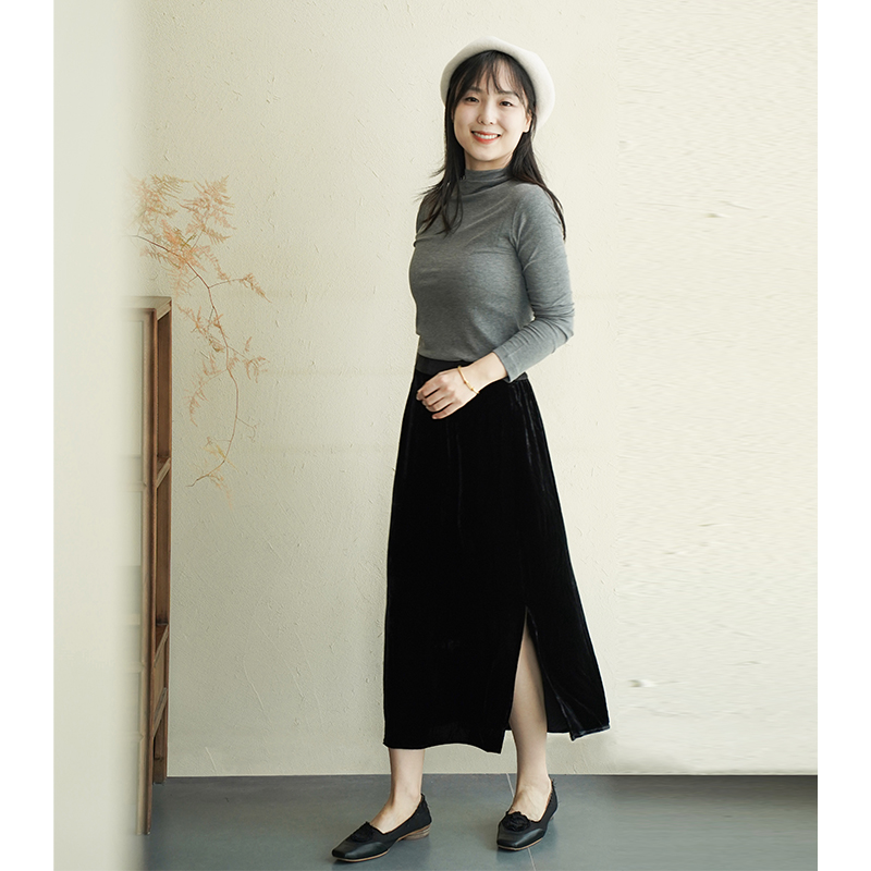 艾绘馆春夏季黑色遮肉显瘦中长款A字裙女复古真丝丝绒优雅半身裙