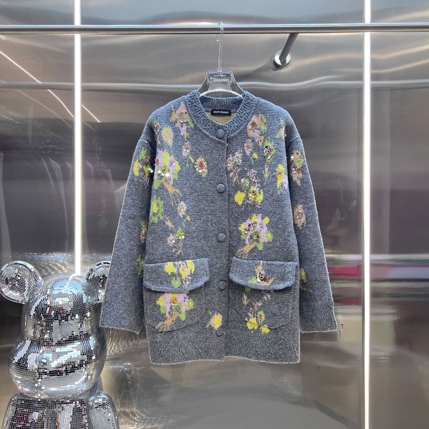0MB.欧洲站新品慵懒奶奶风廓形宽松外套彩色花朵装饰百搭针织开衫