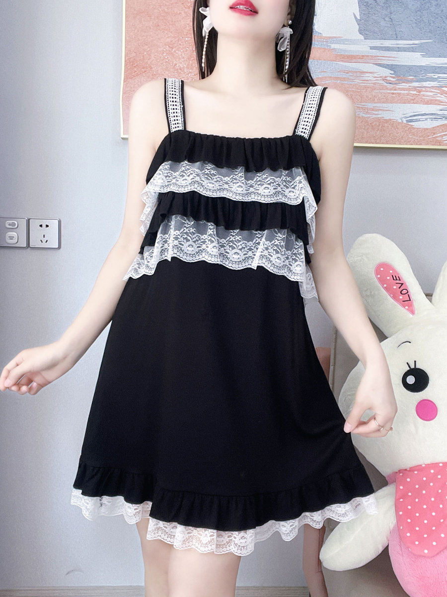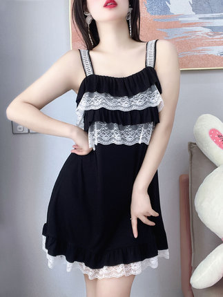 夏款300斤大码纯欲风一字肩睡裙胖MM性感蕾丝湖边吊带睡衣女ins潮