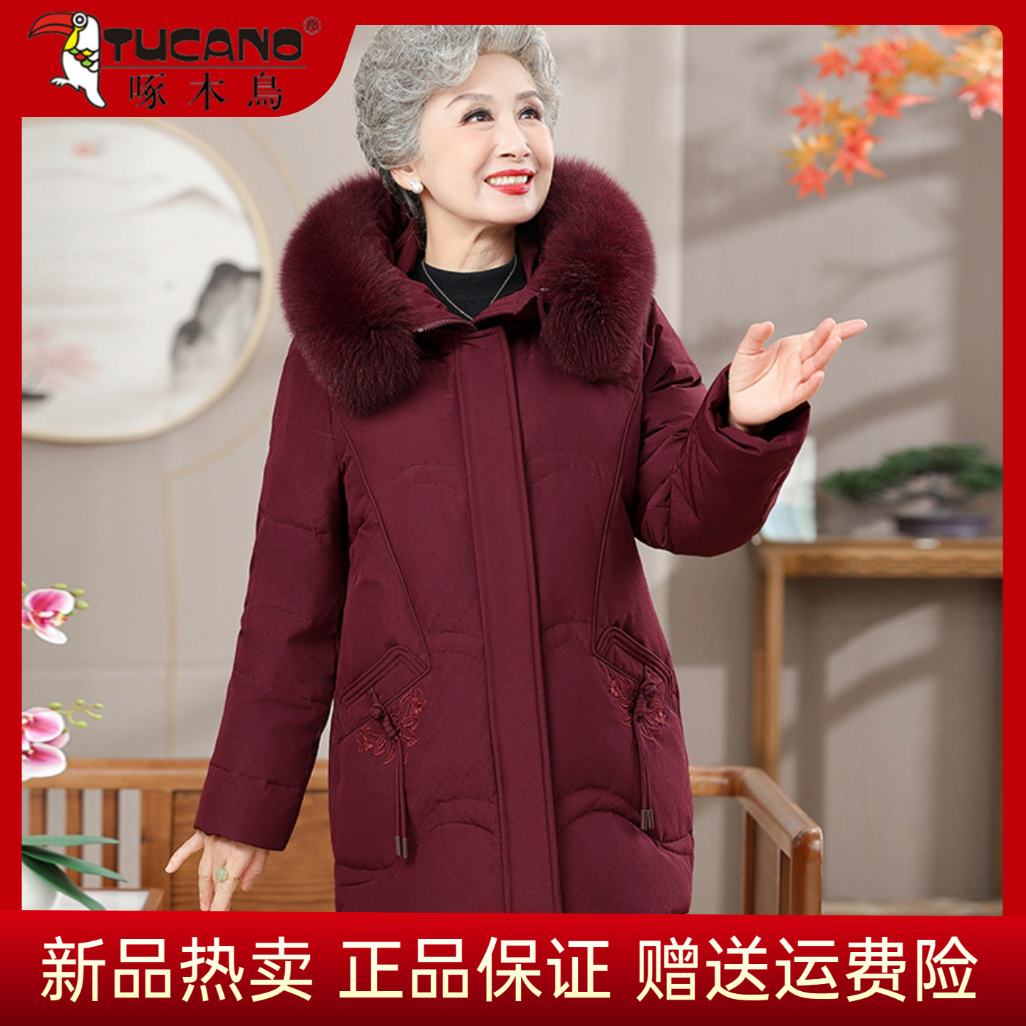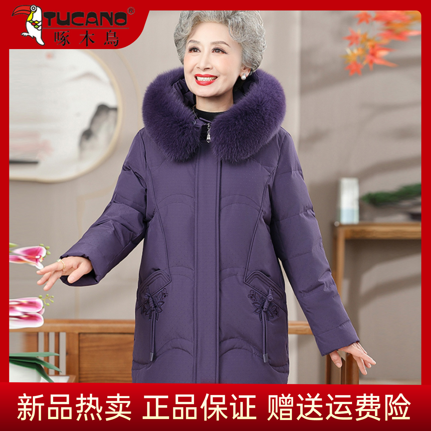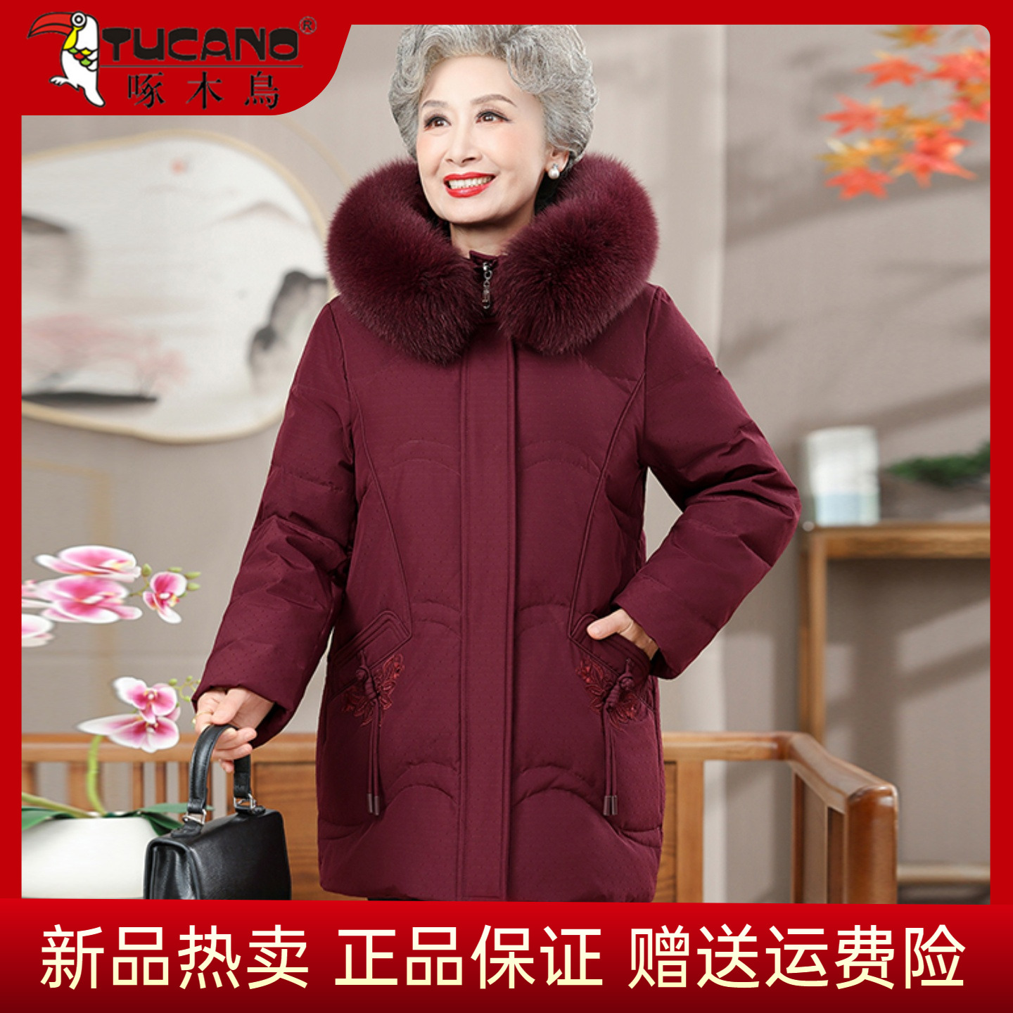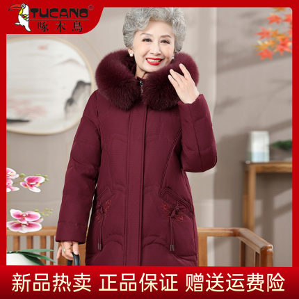 啄木鸟中老年冬装高档抗寒羽绒服奶奶连帽大毛领60岁加厚保暖外套