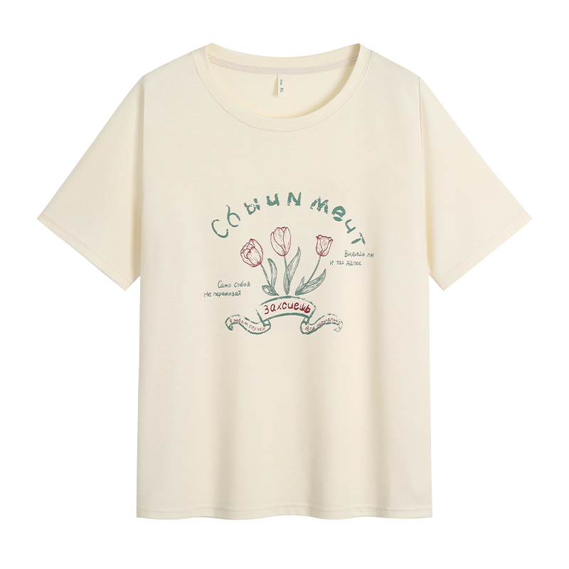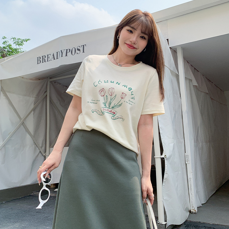 小波家2025夏季胖mm郁金香印花原创设计正肩上衣百搭时尚短袖T恤