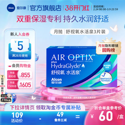 爱尔康视康舒视氧水活泉3片硅水凝胶近视隐形眼镜月抛高透氧运动