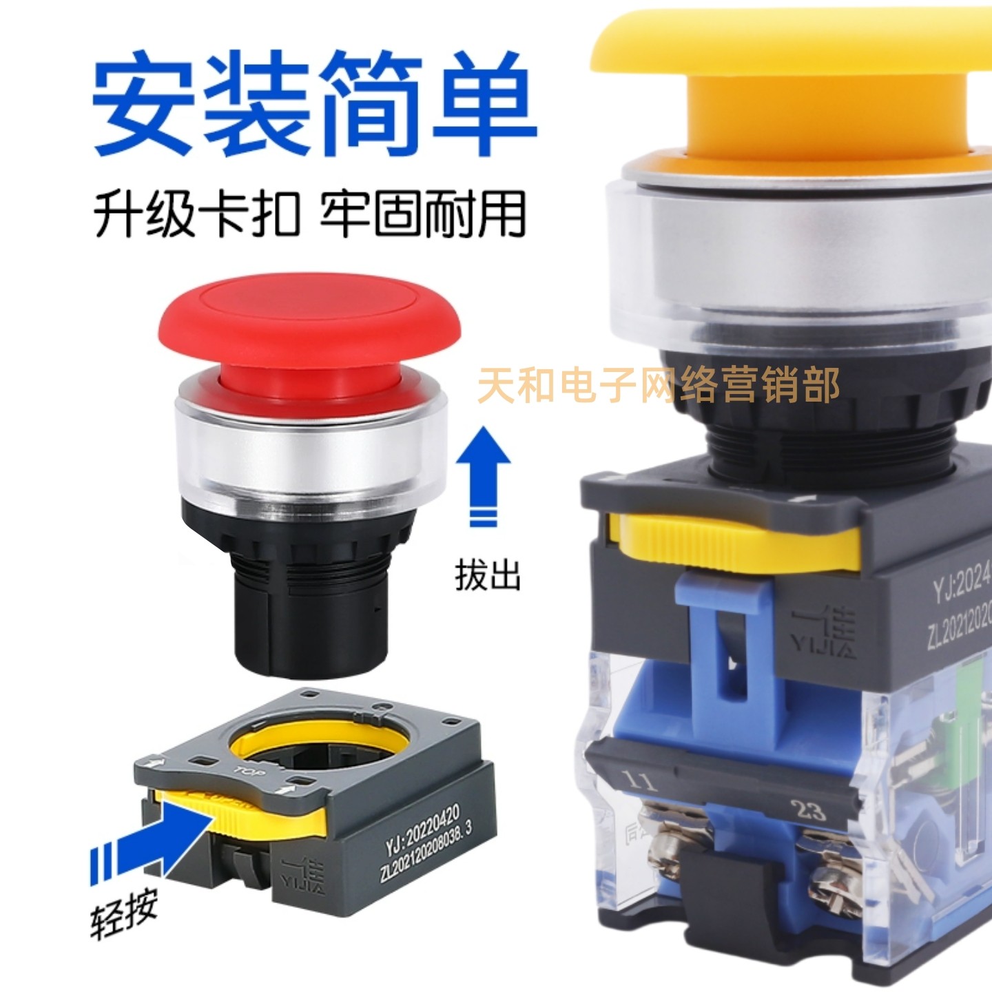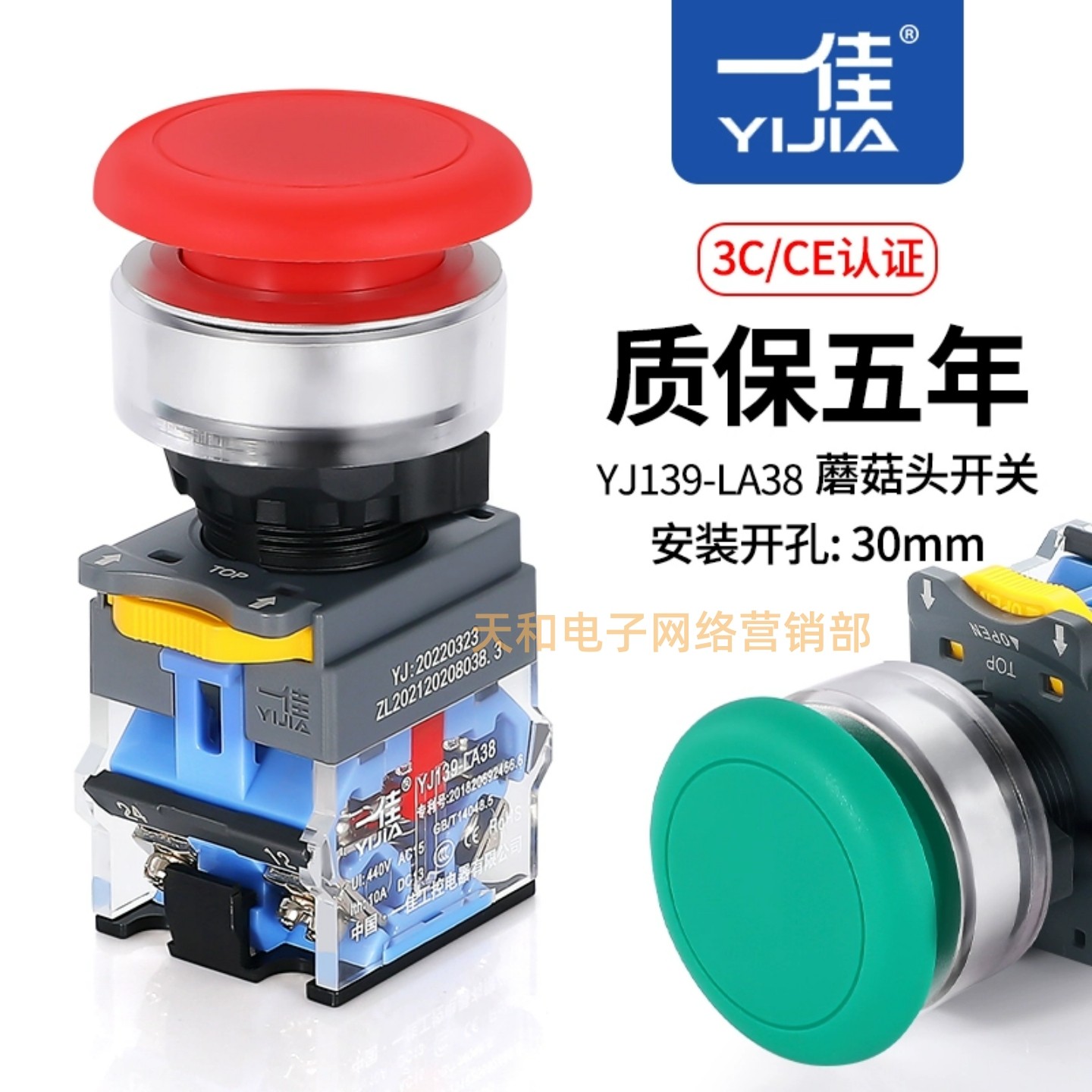 一佳 YJ139-LA38 30mm蘑菇头按钮开关自复位自锁电源启动停止按键