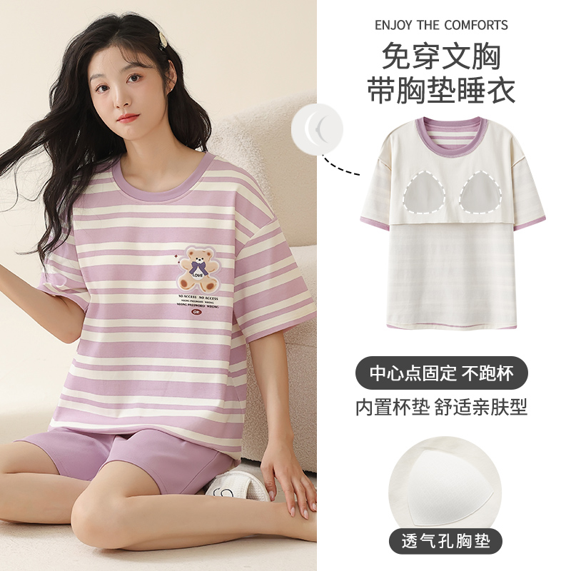 芬腾带胸垫纯棉睡衣女款夏款可外穿简约短袖短裤圆领套装女家居服