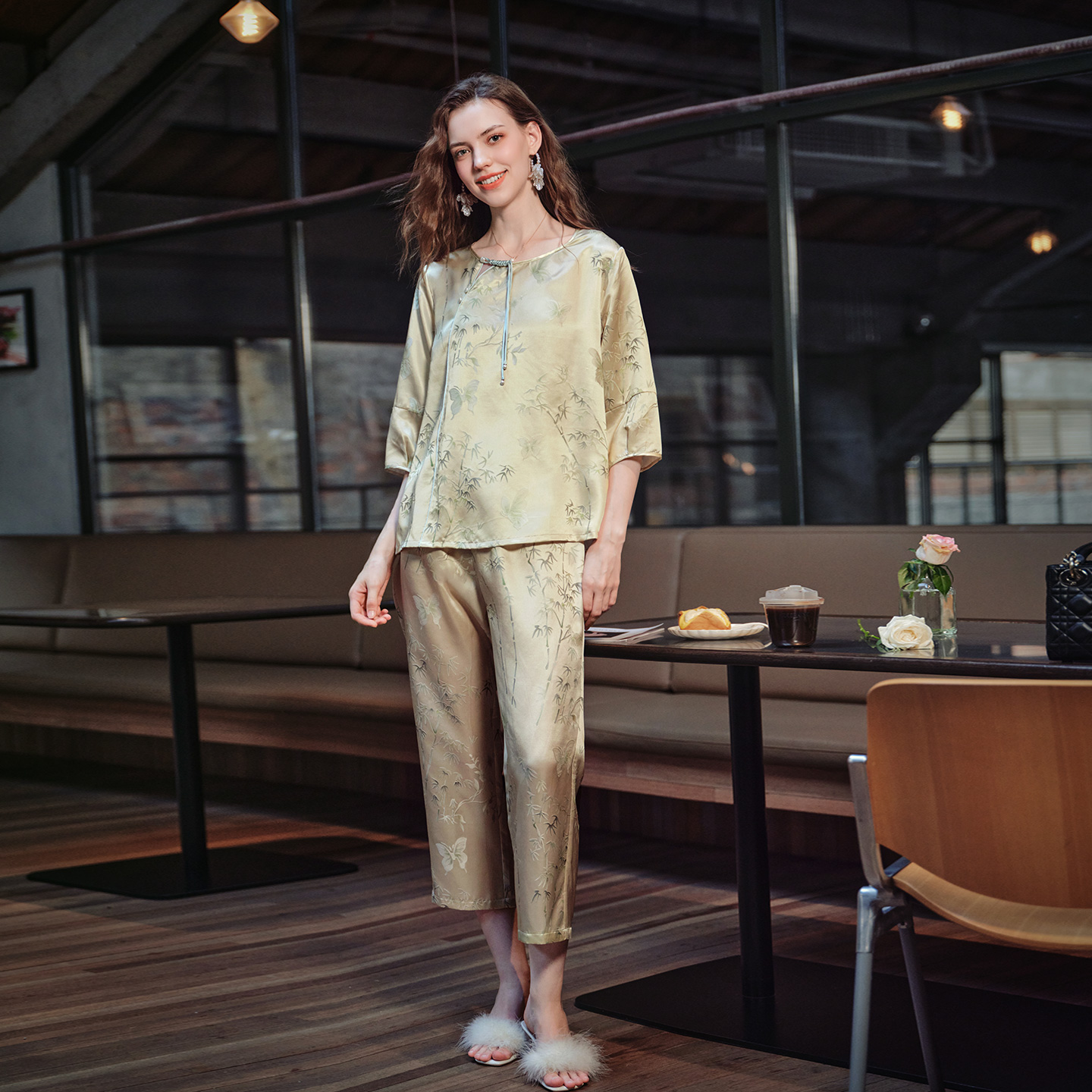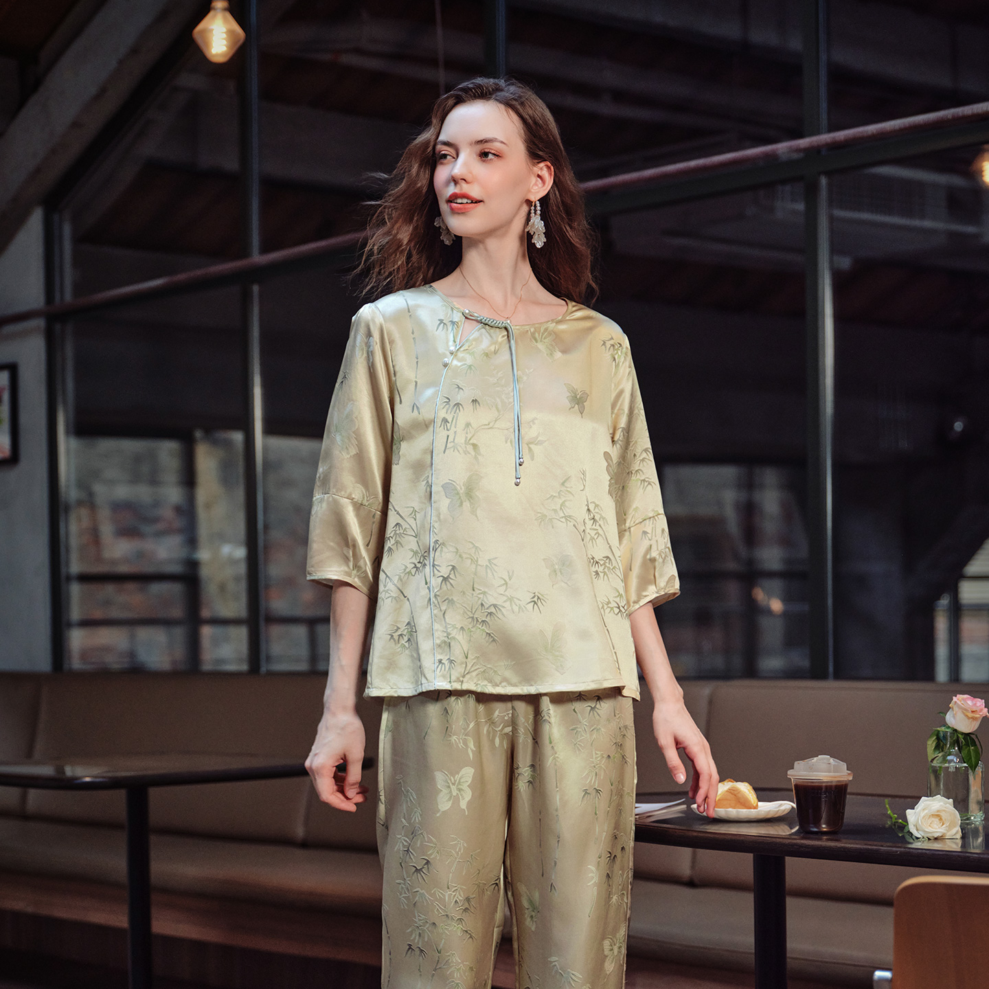 美标新款真丝睡衣套装女春夏浮雕复古新中式中国风桑蚕丝家居服秋