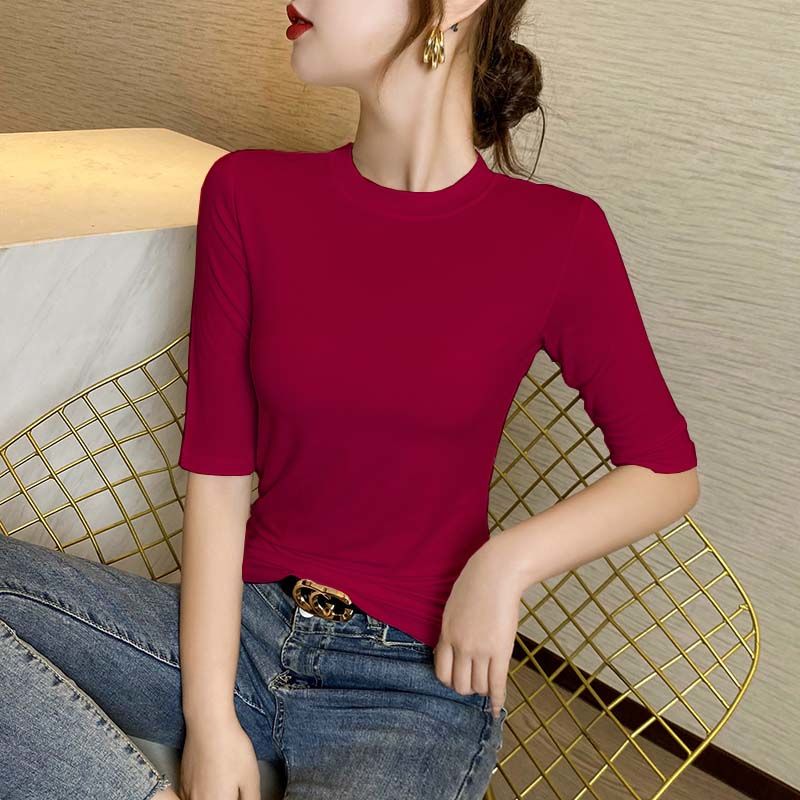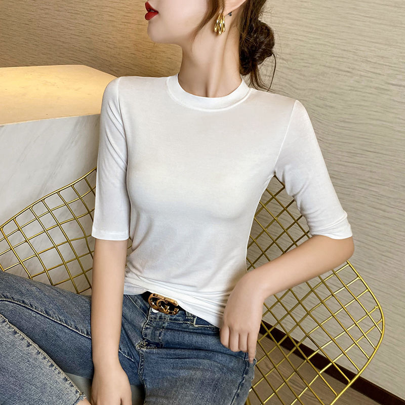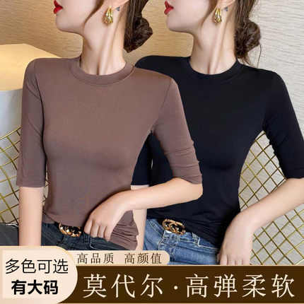 莫代尔半高领中袖t恤女薄款秋冬内搭打底衫五分半袖大码春夏上衣