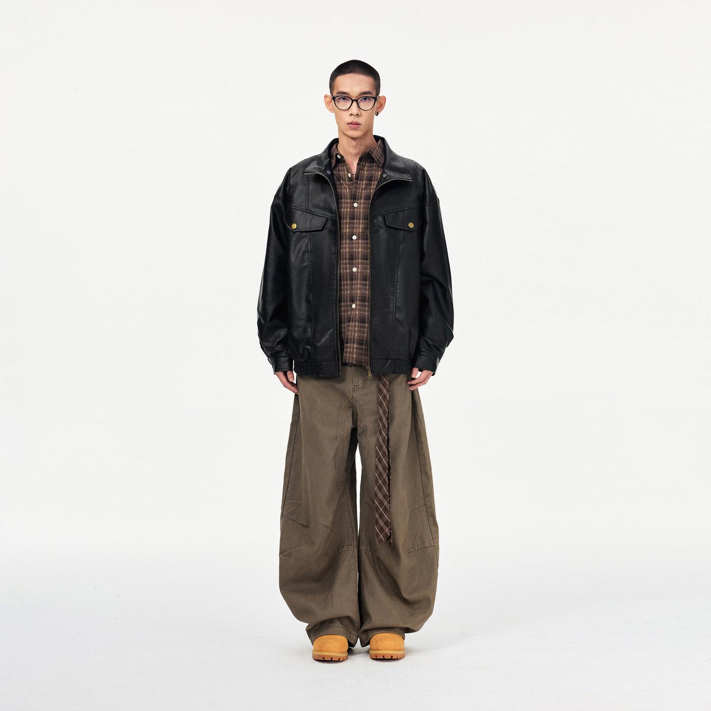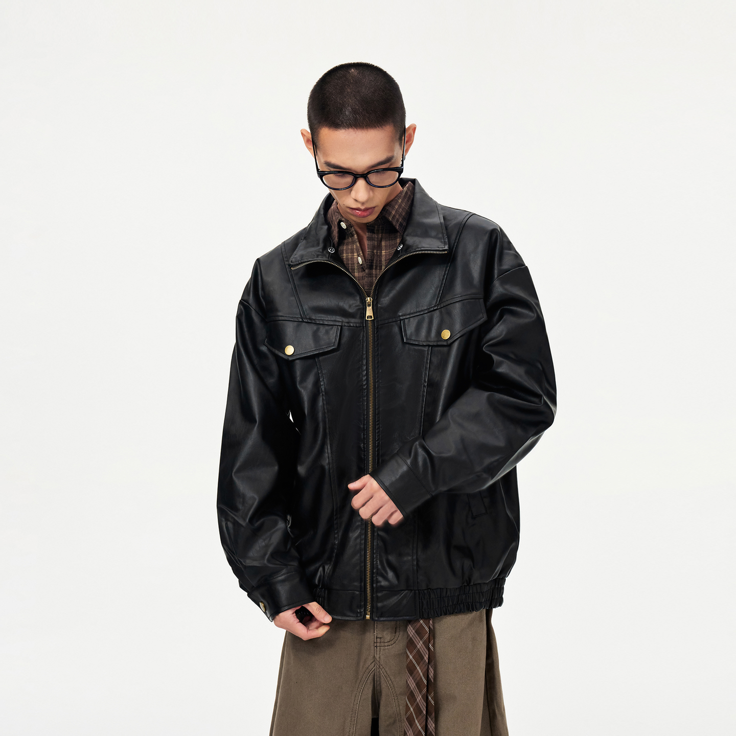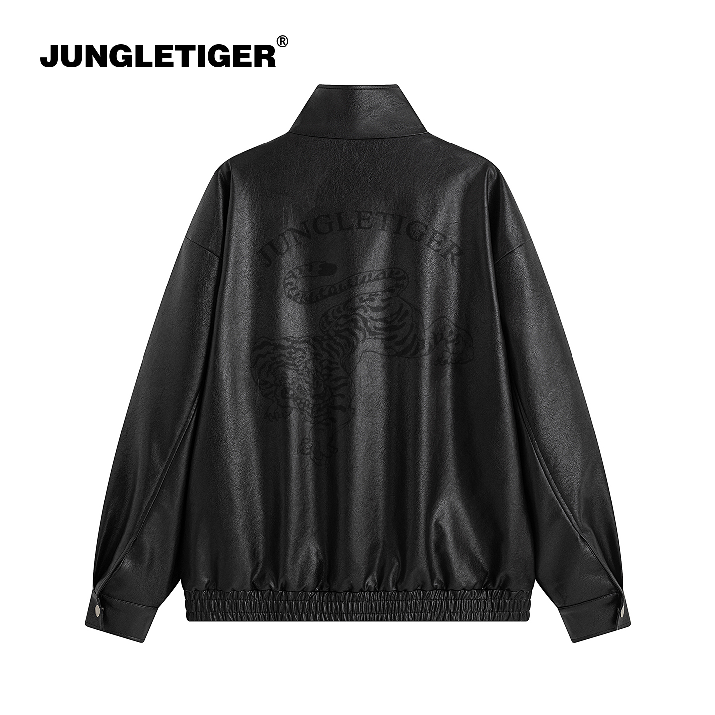 丛林老虎国潮下山虎激光烧花PU皮夹克男秋季新款宽松翻领皮衣外套