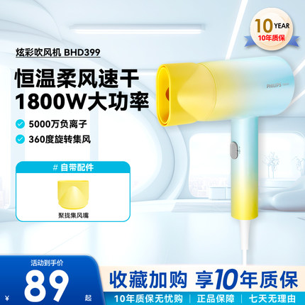 飞利浦电吹风机BHD399负离子护发速干家用学生速干吹风筒大功率女