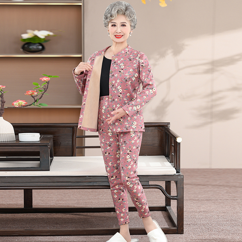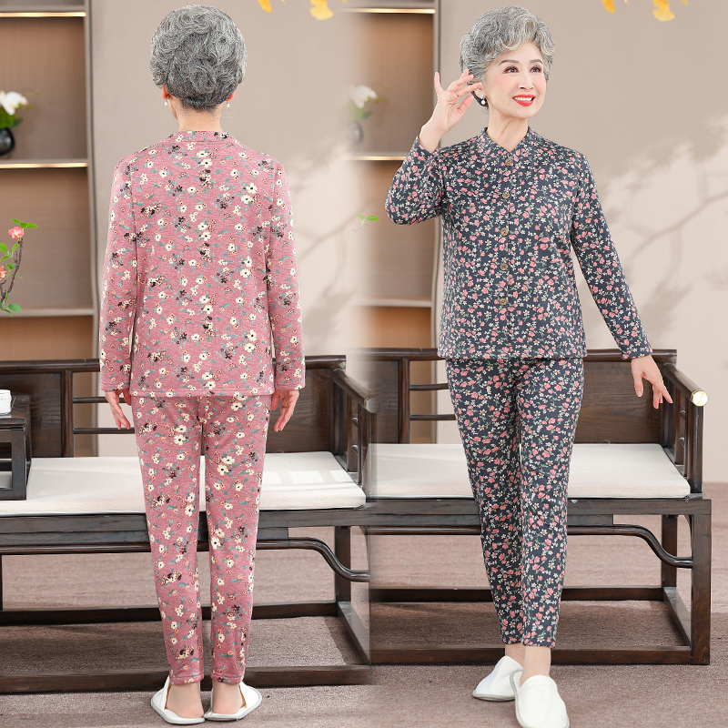 奶奶冬装开衫加绒加厚保暖内衣中老年人女装妈妈秋衣秋裤内搭套装