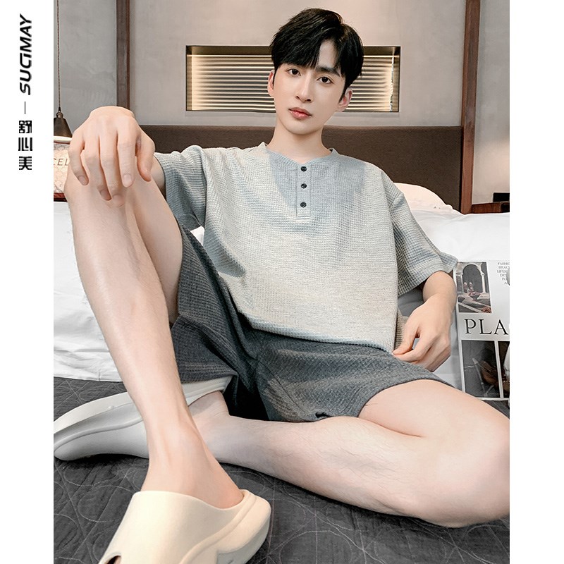 【透气华夫格】睡衣男夏季纯棉短袖家居服夏天薄款大码可外穿套装