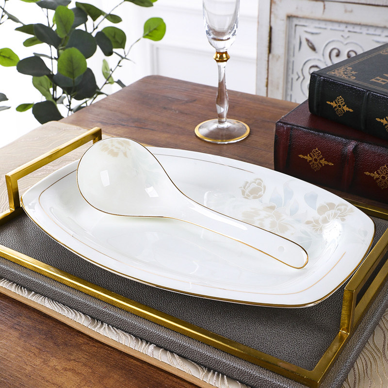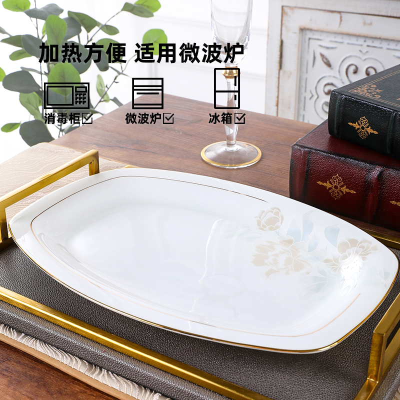家用鱼盘金边骨瓷蒸鱼碟长方形菜盘创意椭圆形大盘餐厅商用网红盘