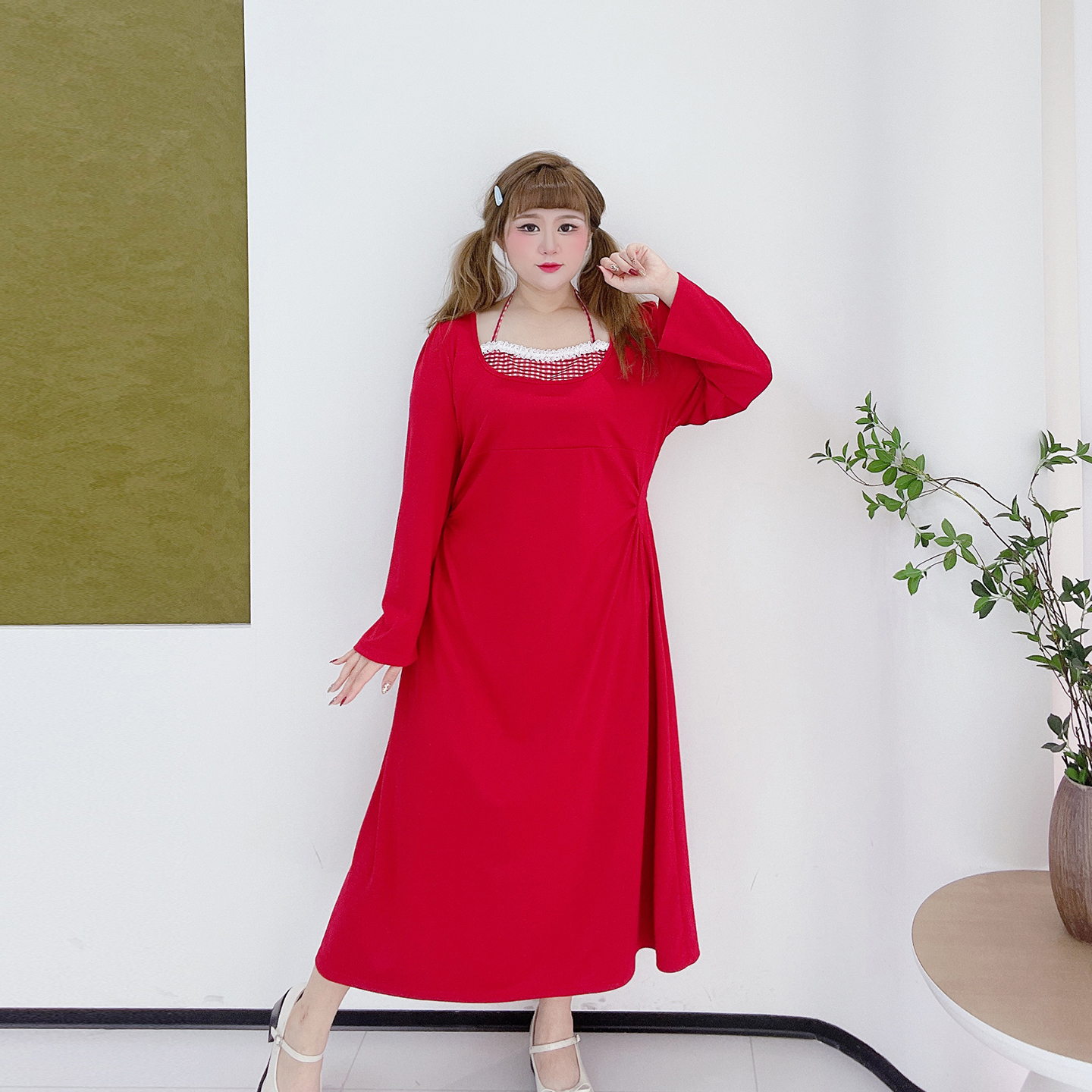 甜美挂脖红色订婚长裙胖莹莹大码女装秋收腰显瘦气质假两件连衣裙